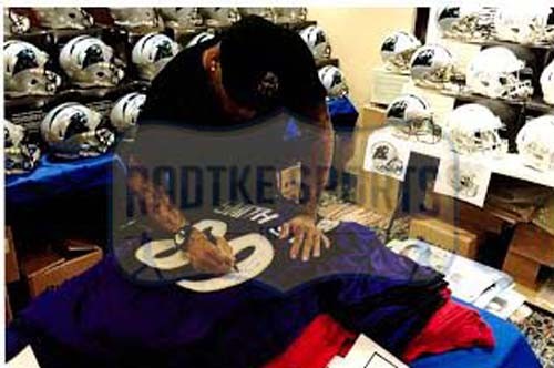 A Baltimore Ravens Framed Custom Jersey hand signed by Steve Smith Sr. The item and signature are in excellent condition. The frame measures approximately 42×34. The frame includes two 8×10 photos – Steve is one of the feistiest players in NFL history. His attitude and determination have made him a fan favorite in Baltimore and Carolina. Now bring home a piece of his exlusive memorabilia line that celebrates the career of a true NFL icon – Radtke Sports and SQOR Sports are the exclusive memorabilia company for Steve Smith Sr. Buy from the only source for current, authentic Steve Smith memorabilia! – AUTHENTICATION: The item is accompanied by an exclusive Radtke Sports/SQOR Sports Certificate of Authenticity – Radtke Sports/SQOR Sports Serial Numbered and Databased Steve Smith Hologram – Picture of Steve from the Signing – *** Radtke Sports uses professional lighting for our product images that may show reflections. We also feature watermarks on our proof pictures. The picture you receive will NOT have a watermark***