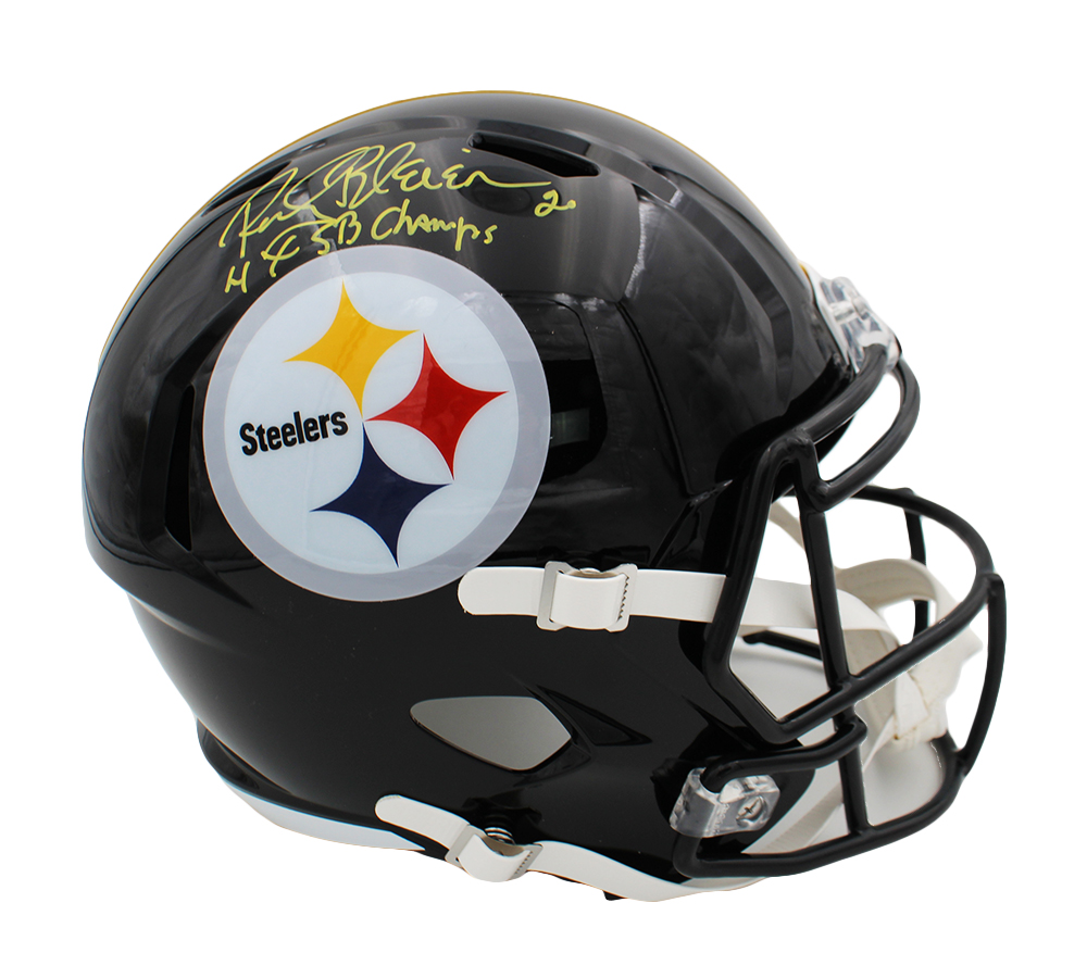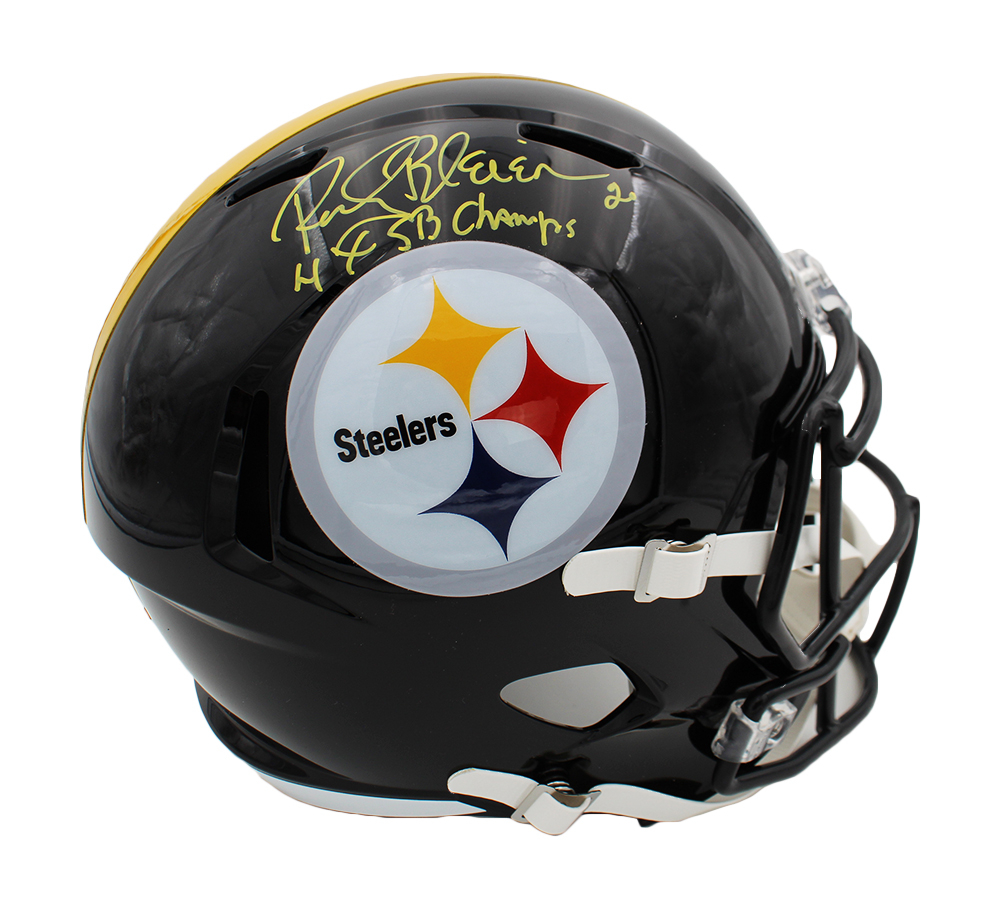A Pittsburgh Steelers Speed Replica NFL Helmet hand signed by Rocky Bleier. The item and signature are in excellent condition. In addition to signing his name, Rocky also inscribed “4x SB Champ” on the item. Rocky is a 4x Superbowl winner and his former position was halfback. AUTHENTICATION: The item is accompanied by a Radtke Sports Certificate of Authenticity – Radtke Sports Serial Numbered and Databased Hologram – Picture of Rocky from the Singing *** Radtke Sports uses professional lighting for our product images that may show reflections. We also feature watermarks on our proof pictures. The picture you receive will NOT have a watermark. ***