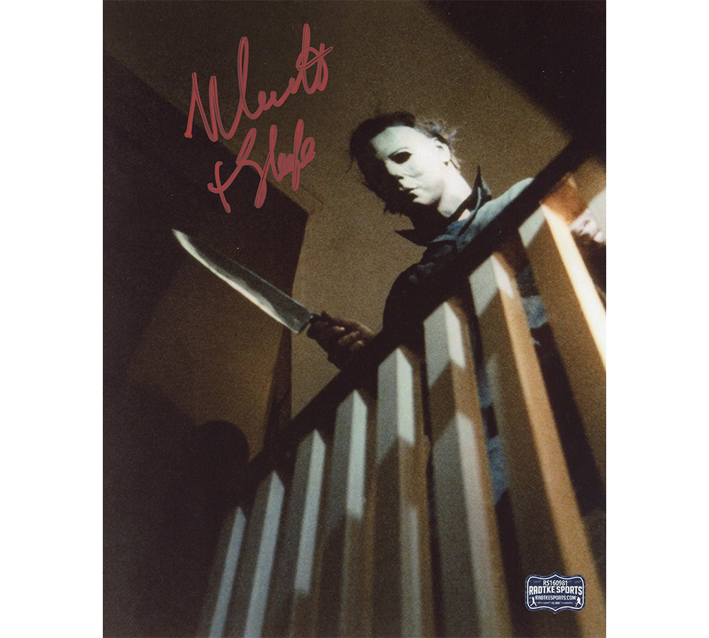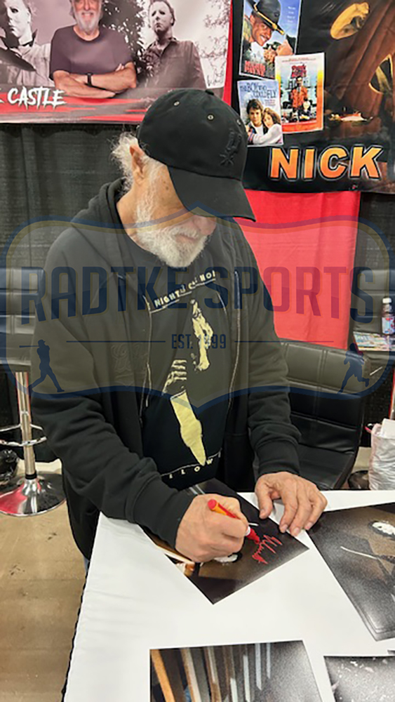 A Halloween Unframed 8×10 Stair Balcony Photo hand signed in red ink by Nick Castle. The item and signature are in excellent condition. In addition to signing his name, Nick also inscribed “The Shape” on the item. Nick Castle is one of the actor who portrays “Michael Myers” in the Halloween film series. AUTHENTICATION: The item has been tagged with a Radtke Sports SmarTag powered by Prova Technology, which gives you digital access to the items authentication records, including a proof picture from the signing. ***Radtke Sports uses professional lighting for their product images that may show reflections. We also feature watermarks on our proof pictures. The picture you see in the authentication record will NOT have a watermark. ***
