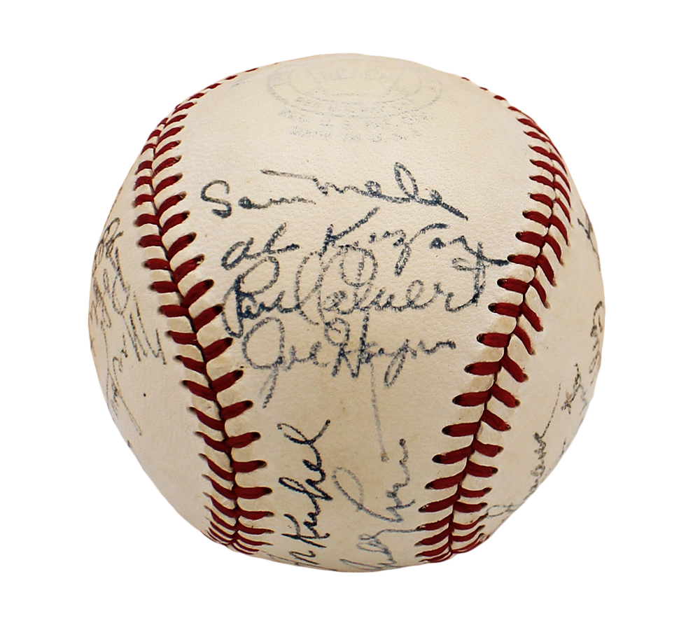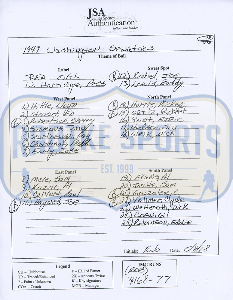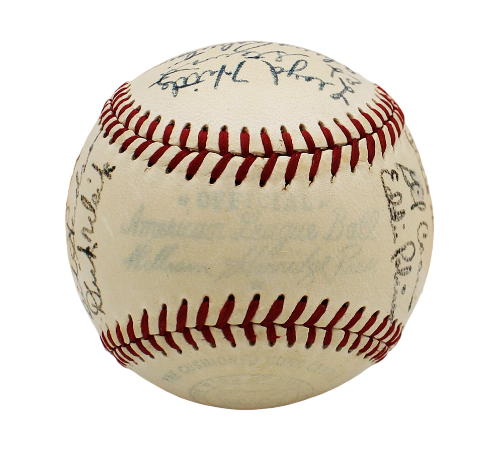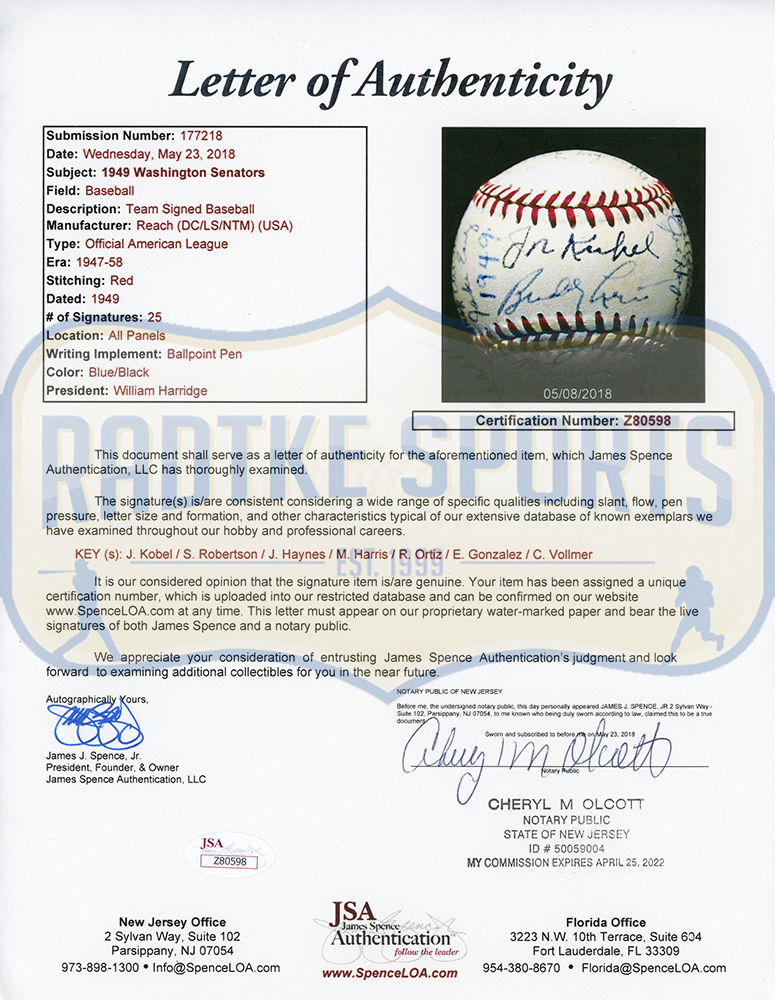 An Official American League MLB Baseball hand signed by 25 – 1949 Washington Senators players including Joe Kuhel, Sherry Robertson, Joe Haynes, Mickey Harris, Robert Ortiz, E Gonzalez, & Clyde Vollmer. AUTHENTICATION: The item is accompanied by a JSA Letter of Authenticity – JSA Serial Numbered and Databased Hologram. ***Radtke Sports uses professional lighting for our product images that may show reflections. ***