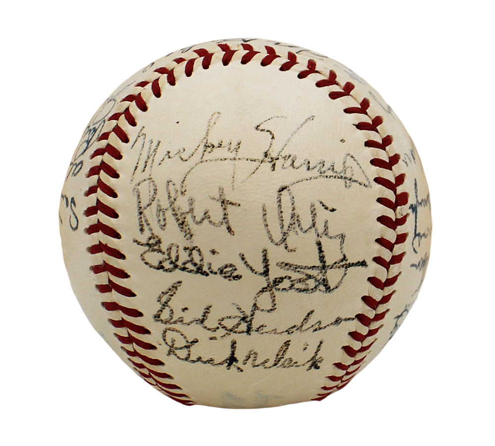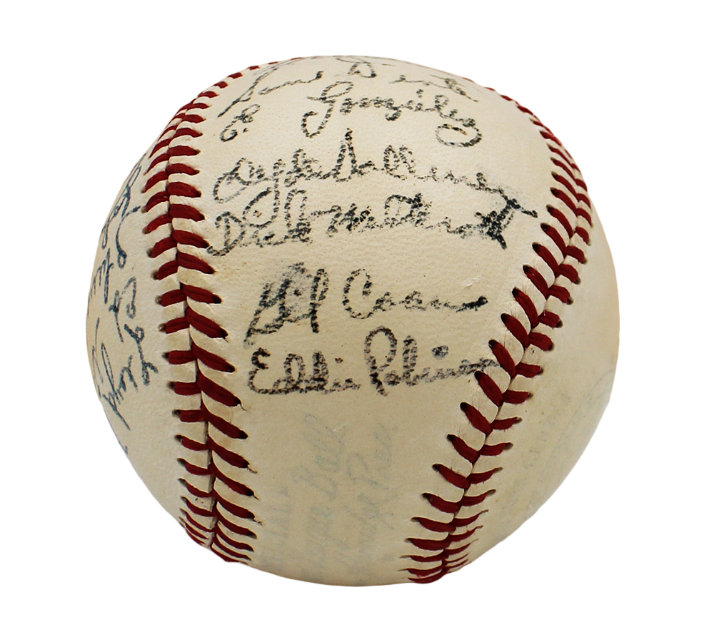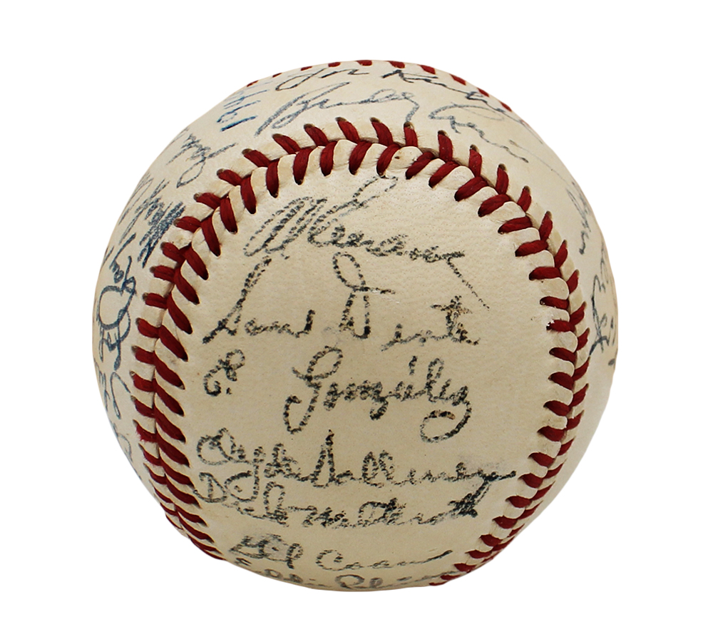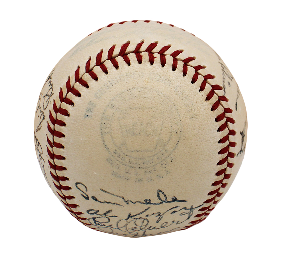 An Official American League MLB Baseball hand signed by 25 – 1949 Washington Senators players including Joe Kuhel, Sherry Robertson, Joe Haynes, Mickey Harris, Robert Ortiz, E Gonzalez, & Clyde Vollmer. AUTHENTICATION: The item is accompanied by a JSA Letter of Authenticity – JSA Serial Numbered and Databased Hologram. ***Radtke Sports uses professional lighting for our product images that may show reflections. ***