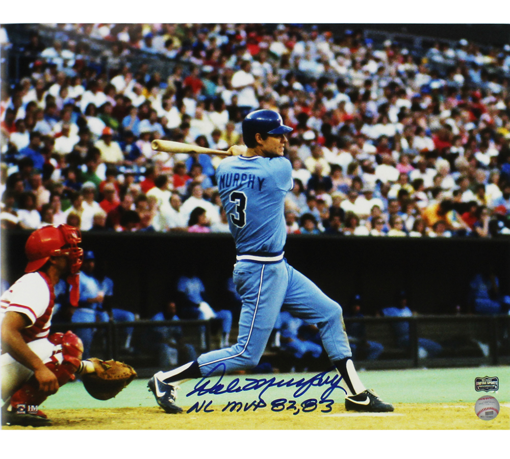 An Atlanta Braves Unframed 16×20 ‘Swinging’ MLB Photo hand signed by Dale Murphy. The item and signature are in excellent condition. In addition to signing his name, Dale also inscribed “82, 83 NL MVP” on the item. 18-year career in Major League Baseball (MLB) from 1976 to 1993, he played as an outfielder, catcher, and first baseman for the Atlanta Braves, Philadelphia Phillies, and Colorado Rockies; Murphy is best noted for his many years with the Braves. His entire MLB career was spent in the National League (NL), during which time he won consecutive Most Valuable Player (MVP) awards (1982–1983), the Silver Slugger Award for four straight years (1982–1985), and the Gold Glove Award for five straight years (1982–1986). AUTHENTICATION: The item has been tagged with a Radtke Sports SmarTag powered by Prova Technology, which gives you digital access to the items authentication records, including a proof picture from the signing. ***Radtke Sports uses professional lighting for their product images that may show reflections. We also feature watermarks on our proof pictures. The picture you see in the authentication record will NOT have a watermark. ***