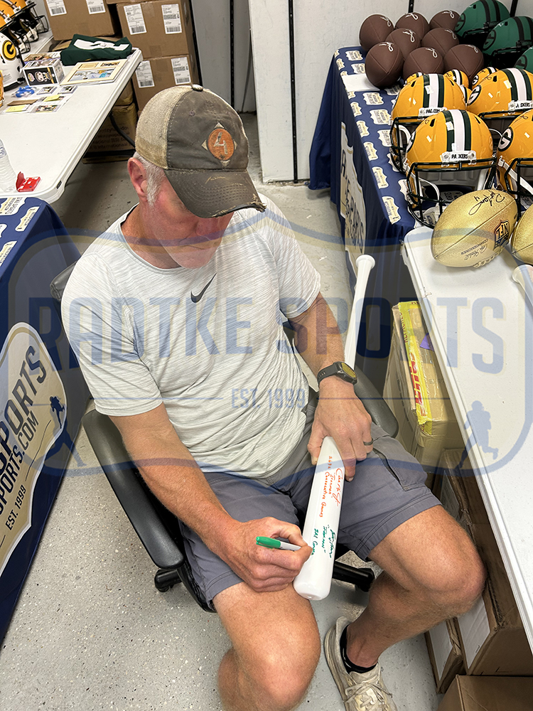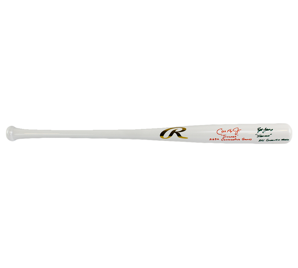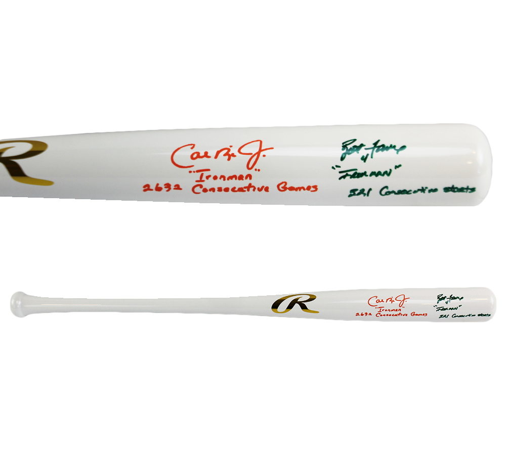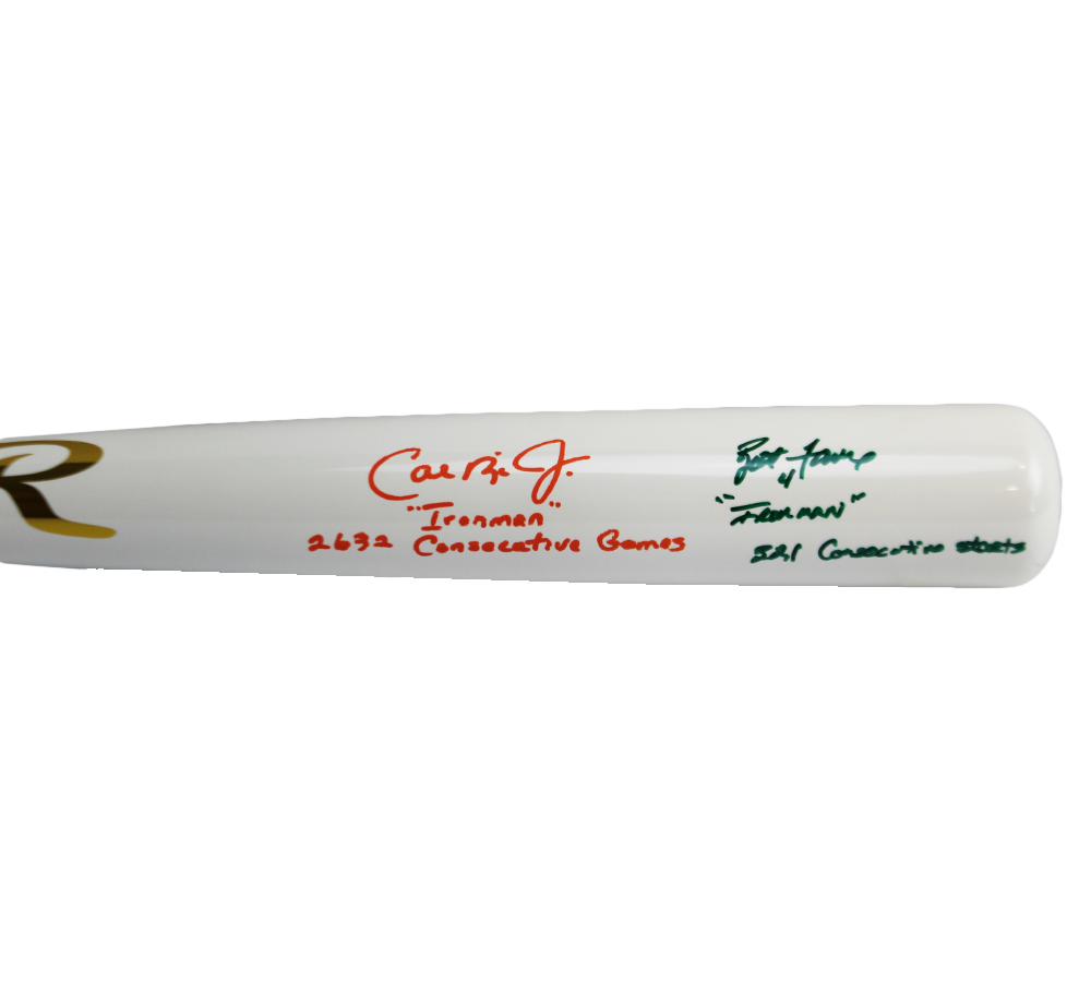 A Baltimore Orioles Rawlings White Chrome MLB Bat hand signed by Cal Ripken Jr. and Brett Favre. The item and signature in orange ink are in excellent condition. In addition to signing his name, Cal inscribed “Ironman” & “2632 Consecutive Games” Brett inscribed “Iron Man & 321 Consecutinve Starts” on the item. Cal is a 19x All-Star player, a 2x Gold Glove Winner, and Cal was a World Series Champion in 1983. A 20 year veteran of the NFL, Brett is a Super Bowl Champion, 11x Pro Bowler, 3x AP NFL Most Valuable Player. AUTHENTICATION: The item has been tagged with a Fanatics Authentic Serial Numbered and Databased Hologram and a Brett Favre Exclusive Radtke Sports SmarTag powered by Prova Technology, which gives you digital access to your items authentication records, including a proof picture from the signing. ***Radtke Sports uses professional lighting for our product images that may show reflections. We also feature watermarks on our proof pictures. The picture you see in your authentication records will NOT have a watermark. ***