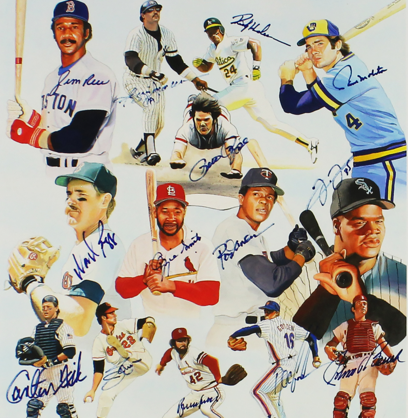 A Field of Dreams A Team of Dreams Unframed 16×23 MLB Print hand signed by artist James Florentino and Athletes Jim Rice, Reggie Jackson, Rickey Henderson, Paul Molitor, Pete Rose, Wade Boggs, Ozzie Smith, Rod Carew, Frank Thomas, Johnny Bench, Doc Gooden, Bruce Sutter, Jim Palmer and Carlton Fisk. The print is PP 8/14. AUTHENTICATION: The item is tagged with a Beckett Serial Numbered and Databased Hologram. *** Radtke Sports uses professional lighting for our product images that may show reflections. ***