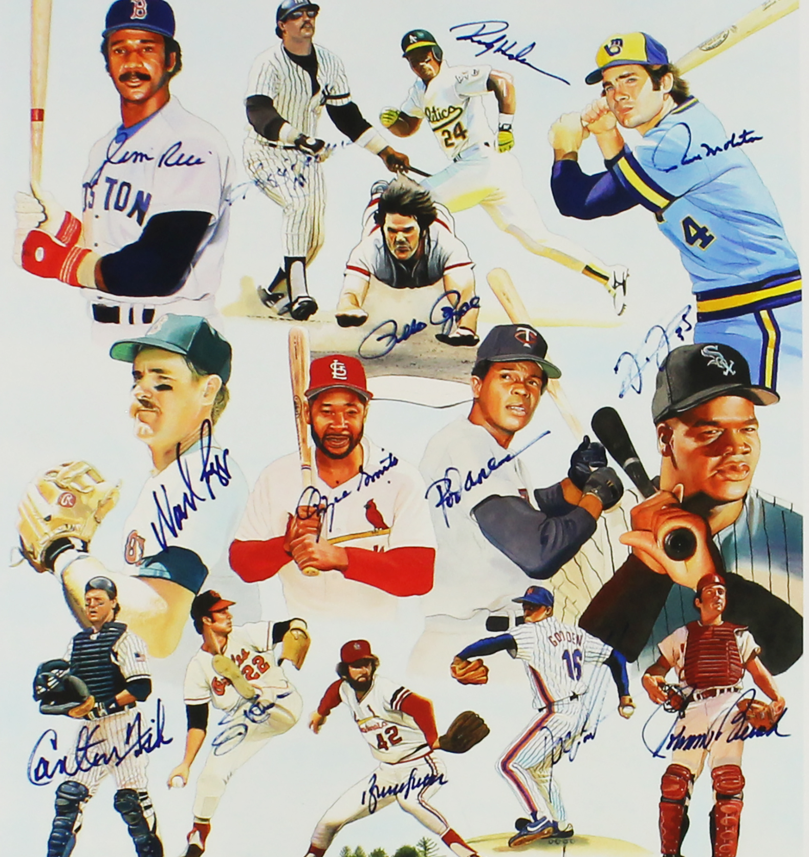 A Field of Dreams A Team of Dreams Unframed 16×23 MLB Print hand signed by artist James Florentino and Athletes Jim Rice, Reggie Jackson, Rickey Henderson, Paul Molitor, Pete Rose, Wade Boggs, Ozzie Smith, Rod Carew, Frank Thomas, Johnny Bench, Doc Gooden, Bruce Sutter, Jim Palmer and Carlton Fisk. The print is PP 11/14. AUTHENTICATION: The item is tagged with a Beckett Serial Numbered and Databased Hologram. *** Radtke Sports uses professional lighting for our product images that may show reflections. ***