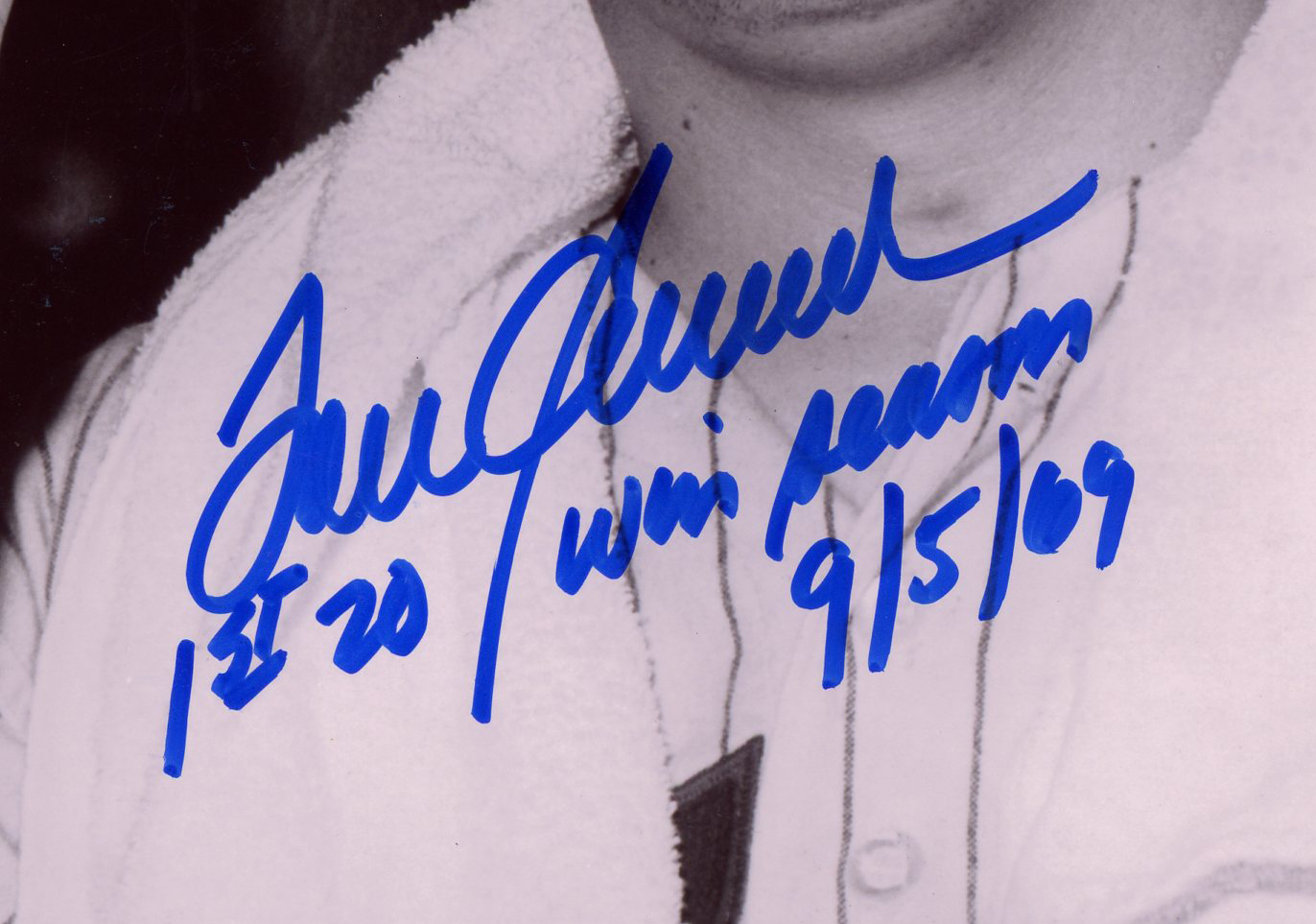 Tom Seaver Signed New York Mets Unframed 8×10 Black & White Holding Ball MLB Vertical Photo – Blue Ink with “1st 20 Wins Season 9/5/69” Inscription