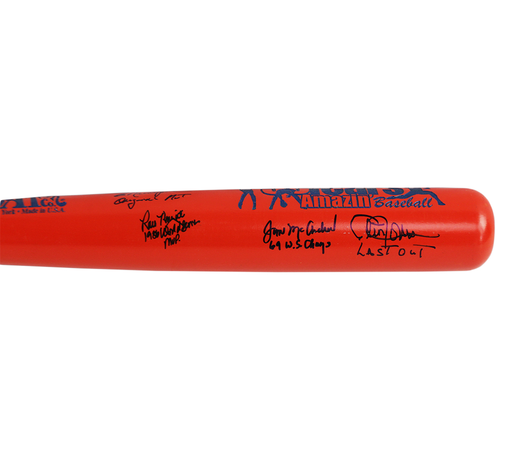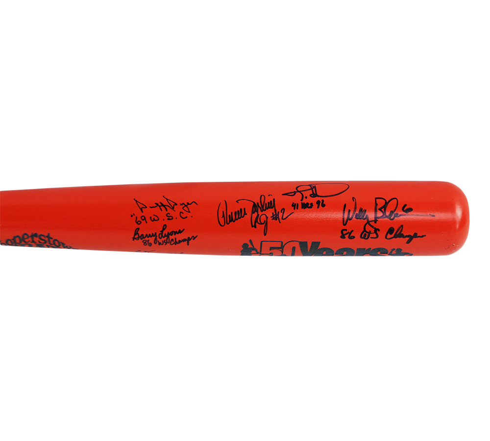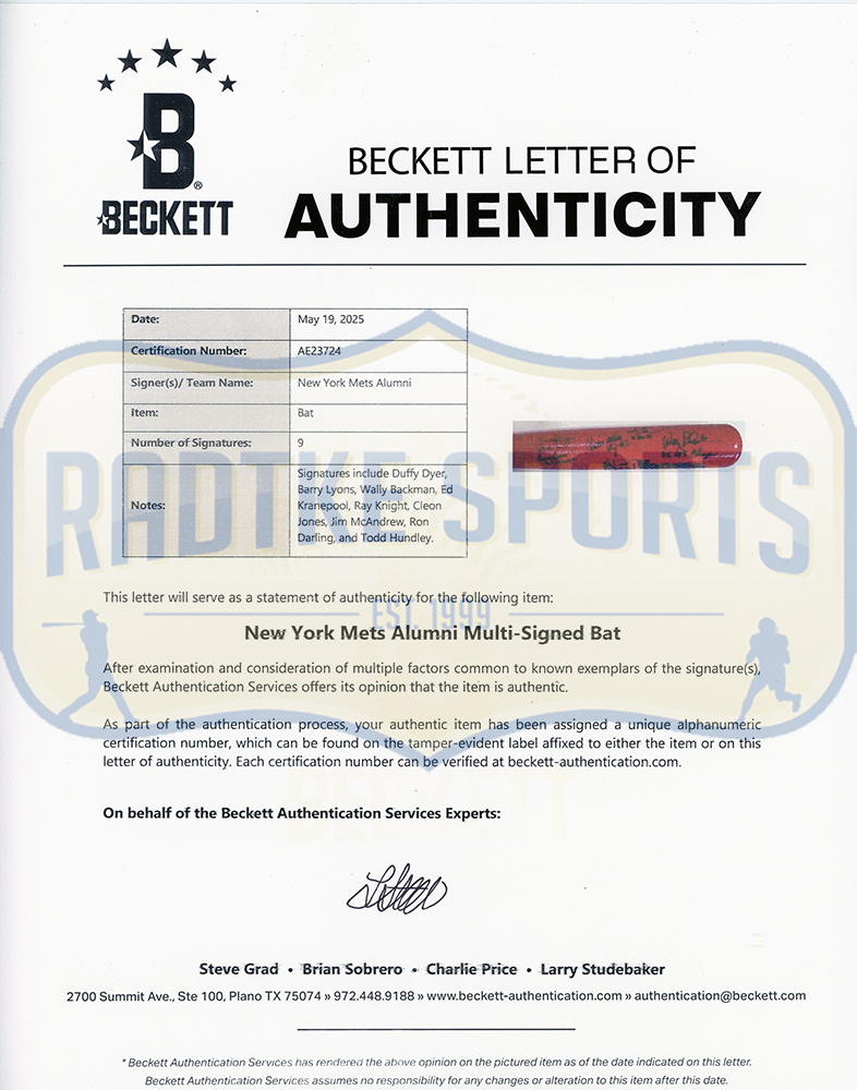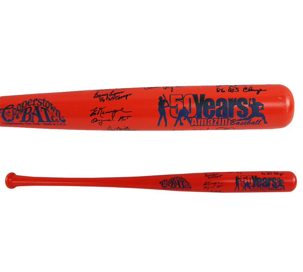 A Coopertown Custom 50 Years Orange MLB Bat hand signed by 9 New York Mets Alumni including Duffy Dyer, Barry Lyons, Wally Backman, Ed Kranepool, Ray Knight, Cleon Jones, Jim McAndrew, Ron Darling, and Todd Hundley. The item and signature are in excellent condition. AUTHENTICATION: The item is accompanied by a Beckett Letter of Authenticity – Beckett Serial Numbered and Databased Hologram. *** Radtke Sports uses professional lighting for our product images that may show reflections.***