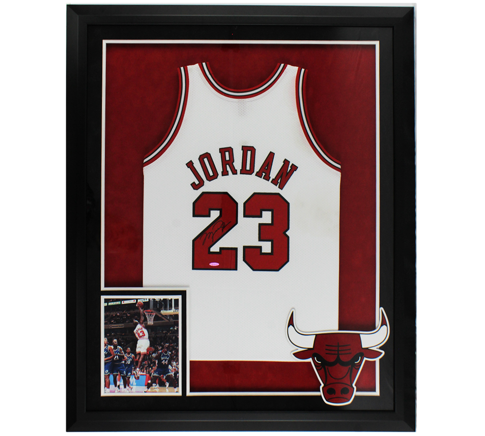 Michael Jordan Signed Chicago Bulls Large Framed White Basketball Jersey – Upper Deck Authenticated