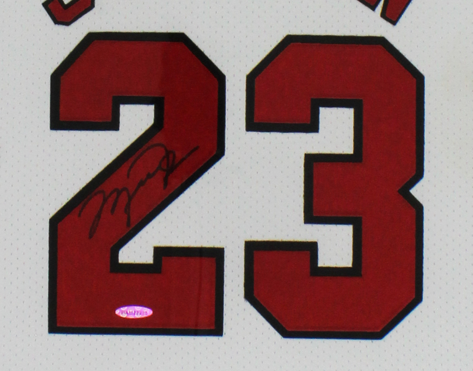 A Chicago Bulls Large Framed White Basketball Jersey hand signed by Michael Jordan. The item and signature are in excellent condition. The frame measures approximately 36×44 and features an 8×10 Photos of Michael Jordan. Michael Jordan is one of the greatest basketball players of all time. He played 15 season for the Chicago Bulls. He is a 6x NBA Champion, 6x NBA Finals MVP, 3x All Star MVP, hold 10 scoring titles. AUTHENTICATION: The item is accompanied by an Upper Deck Serial Numbered and Databased Hologram *** Radtke Sports uses professional lighting for our product images that may show reflections.***