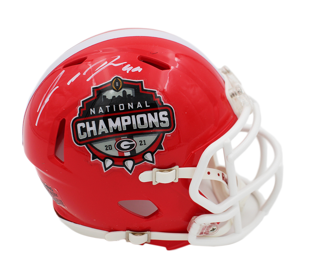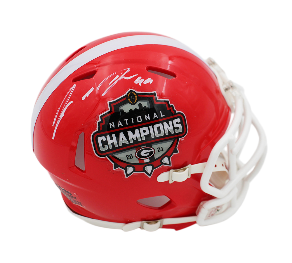 A Georgia Bulldogs Speed National Champ Edition NCAA Mini Helmet hand signed by Jordan Davis. The item and signature are in excellent condition. Jordan was CFP National Champion (2021). Jordan is Chuck Bednarik Award (2021). Jordan has Outland Trophy (2021). Jordan was Unanimous All-American (2021). Jordan a First-team All-SEC (2021).AUTHENTICATION: The item is accompanied by a Radtke Sports Certificate of Authenticity – Radtke Sports Serial Numbered and Databased Hologram – Picture of JordanĀ from the Signing *** Radtke Sports uses professional lighting for our product images that may show reflections. We also feature watermarks on our proof pictures. The picture you receive will NOT have a watermark. ***