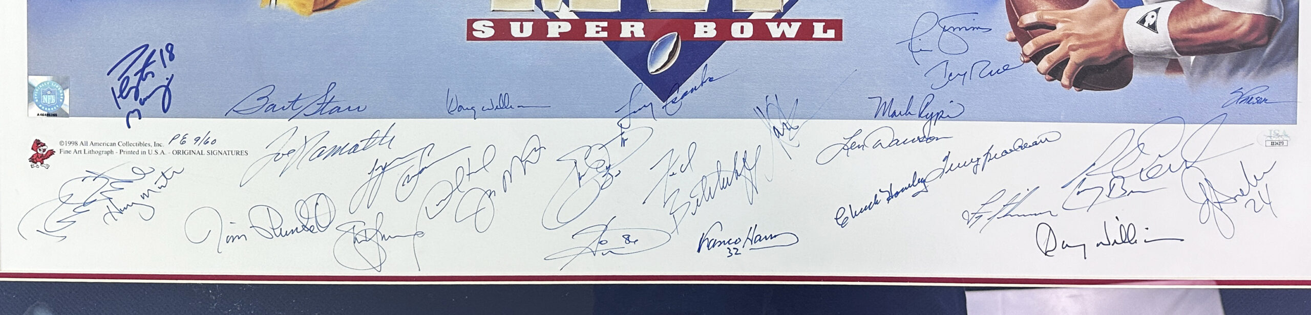 A Framed Super Bowl Print hand signed by 28 Super Bowl MVP’s including: Bart Star, Joe Montana, Joe Namath, Jerry Rice, Emmitt Smith, Lynn Swann, Terry Bradshaw, Troy Aikman, Peyton Manning, Len Dawson, Fred Biletnikoff, Larry Csonka, Steve Young, Fanco Harris, Chuck Howley, Phil Simms, Doug Williams and Hines Ward. The item and signatures are in excellent condition. The frame measures approximately 36″x42″. AUTHENTICATION: The item has a JSA Serial Numbered and Databased Hologram ****Radtke Sports uses professional lighting for our product images that may show reflections. ***