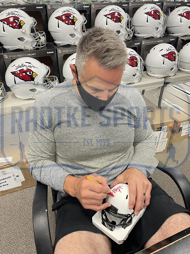 An Arizona Cardinals Speed Lunar NFL Mini Helmet Hand Signed by Kurt Warner. The item and signature are in excellent condition. Kurt is a Super Bowl Champion in (XXXIV). Kurt position for playing on the field is a Quarterback. Kurt is a Super Bowl MVP in (XXXIV). Kurt a 2xNFL Most Valuable Player. Kurt a 2xFirst-Team ALL-Pro from 1999,2001. Kurt was a 4xPro Bowl in 1999-2001,2008. AUTHENTICATION: The item is accompanied by a Radtke Sports Certificate of Authenticity – Radtke Sports Serial Numbered and Databased Hologram – Picture of Kurt from the Signing *** Radtke Sports uses professional lighting for our product images that may show reflections. We also feature watermarks on our proof pictures. The picture you receive will NOT have a watermark. ***