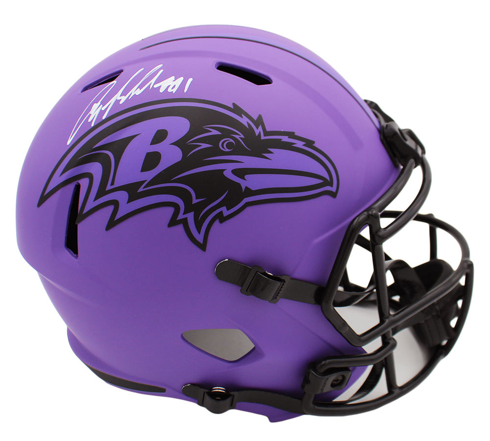 A Baltimore Ravens Speed Replica Rave NFL Helmet hand signed by Anquan Boldin. The item and signature are in excellent condition. Anquan Boldin is a wide receiver who spent 14 seasons in the NFL. He was drafted by the Arizona Cardinals in 2003. He also played for the Baltimore Ravens, San Francisco 49ers, and Detroit Lions. He was the 2003 NFL Offensive Rookie of the Year, was selected to three Pro Bowls, and won Super Bowl XLVII with the Ravens. AUTHENTICATION: The item is accompanied by a Beckett Serial Numbered and Databased Hologram *** Radtke Sports uses professional lighting for our product images that may show reflections. ***