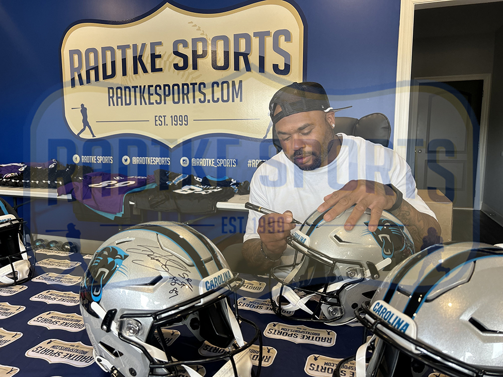 A Carolina Panthers Speed Flex Authentic NFL Helmet hand signed by Steve Smith Sr. The item and signature are in excellent condition. In addition to signing his name, Steve also inscribed “Agent 89” on the item. Steve is one of the feistiest players in NFL history. His attitude and determination have made him a fan favorite in Baltimore and Carolina. Now bring home a piece of his exclusive memorabilia line that celebrates the career of a true NFL icon. AUTHENTICATION: The item has been tagged with a Radtke Sports SmarTag powered by Prova Technology, which gives you digital access to the items authentication records, including a proof picture from the signing. ***Radtke Sports uses professional lighting for their product images that may show reflections. We also feature watermarks on our proof pictures. The picture you see in the authentication record will NOT have a watermark. ***