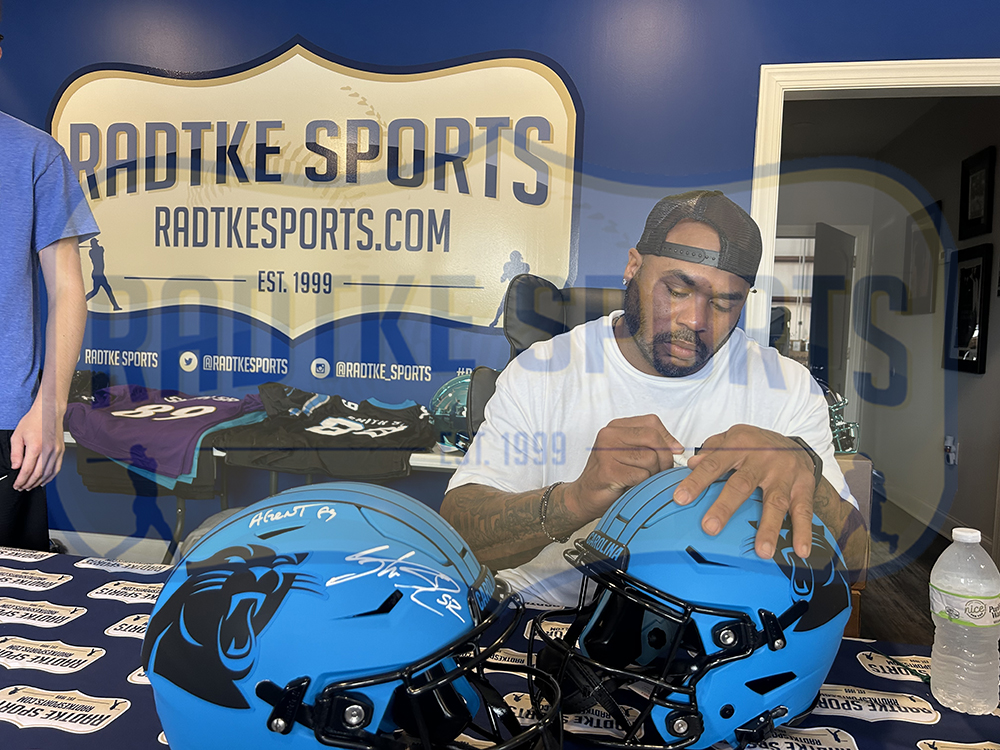 A Carolina Panthers Speed Flex Authentic Rave NFL Helmet hand signed by Steve Smith Sr. In addition to signing his name, Steve also inscribed “Agent 89” on the item. The item and signature are in excellent condition. Steve is one of the feistiest players in NFL history. His attitude and determination have made him a fan favorite in Baltimore and Carolina. Now bring home a piece of his exclusive memorabilia line that celebrates the career of a true NFL icon. AUTHENTICATION: The item has been tagged with a Radtke Sports SmarTag powered by Prova Technology, which gives you digital access to the items authentication records, including a proof picture from the signing. ***Radtke Sports uses professional lighting for their product images that may show reflections. We also feature watermarks on our proof pictures. The picture you see in the authentication record will NOT have a watermark. ***