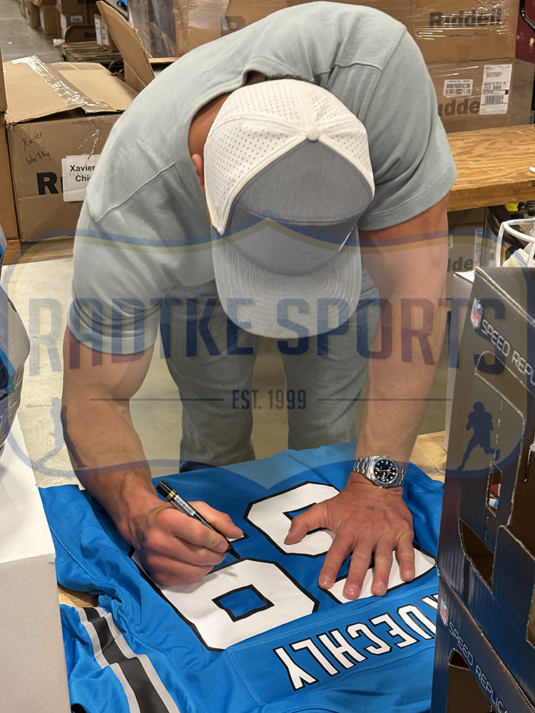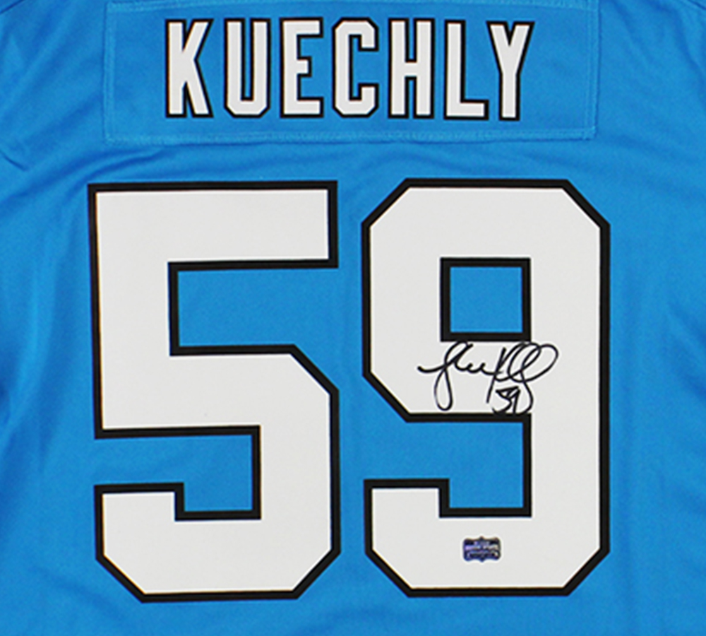 A Carolina Panthers Nike Game Blue NFL Jersey hand signed by Luke Kuechly. The item and signature are in excellent condition – Luke established himself as an elite talent quickly by winning Defensive Rookie of the Year Award and then Defensive Player of the Year. He is a 7x Pro Bowler and 3x Butkus Award winner. AUTHENTICATION: The item has been tagged with a Radtke Sports SmarTag powered by Prova Technology, which gives you digital access to the items authentication records, including a proof picture from the signing. ***Radtke Sports uses professional lighting for their product images that may show reflections. We also feature watermarks on our proof pictures. The picture you see in the authentication record will NOT have a watermark. ***