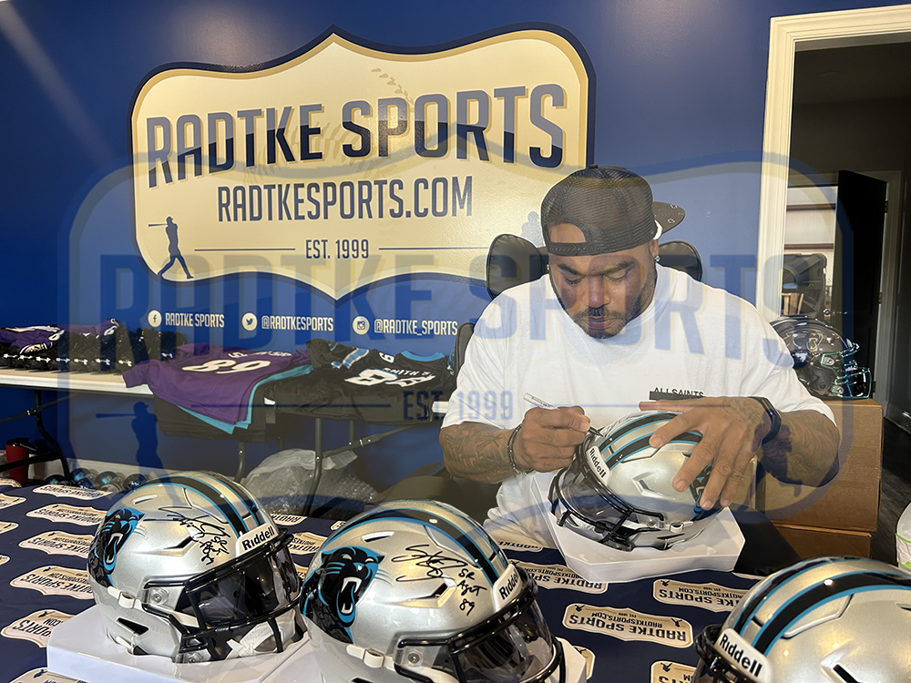 A Carolina Panthers Speed Flex Mid-Size NFL Midi Helmet hand signed by Steve Smith Sr. The item and signature are in excellent condition. In addition to signing his name, Steve also inscribed “Agent 89” on the item. Steve is one of the feistiest players in NFL history. His attitude and determination have made him a fan favorite in Baltimore and Carolina. Now bring home a piece of his exclusive memorabilia line that celebrates the career of a true NFL icon. AUTHENTICATION: The item has been tagged with a Radtke Sports SmarTag powered by Prova Technology, which gives you digital access to the items authentication records, including a proof picture from the signing. ***Radtke Sports uses professional lighting for their product images that may show reflections. We also feature watermarks on our proof pictures. The picture you see in the authentication record will NOT have a watermark. ***