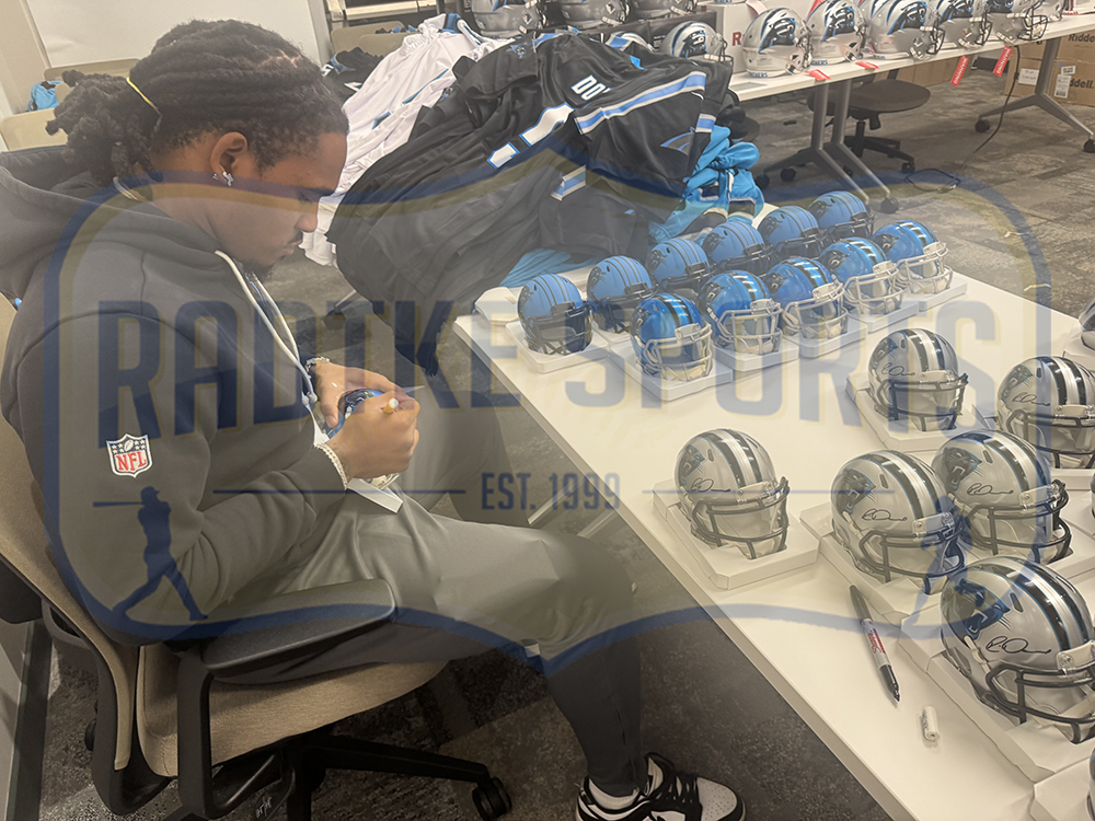 A Carolina Panthers Speed Flash NFL Mini Helmet hand signed by Rico Dowdle. The item and signature are in excellent condition. Dowdle is a free agent professional football player who started with the Dallas Cowboys before playing for the Carolina Panthers. AUTHENTICATION: Your item is tagged with a Rob Gronkowski exclusive Radtke Sports SmarTag powered by Prova Technology, which gives you digital access to your items authentication records, which includes a proof picture from the signing. *** Radtke Sports uses professional lighting for our product images that may show reflections. We also feature watermarks on our proof pictures. The picture you see in your authentication records will NOT have a watermark. ***
