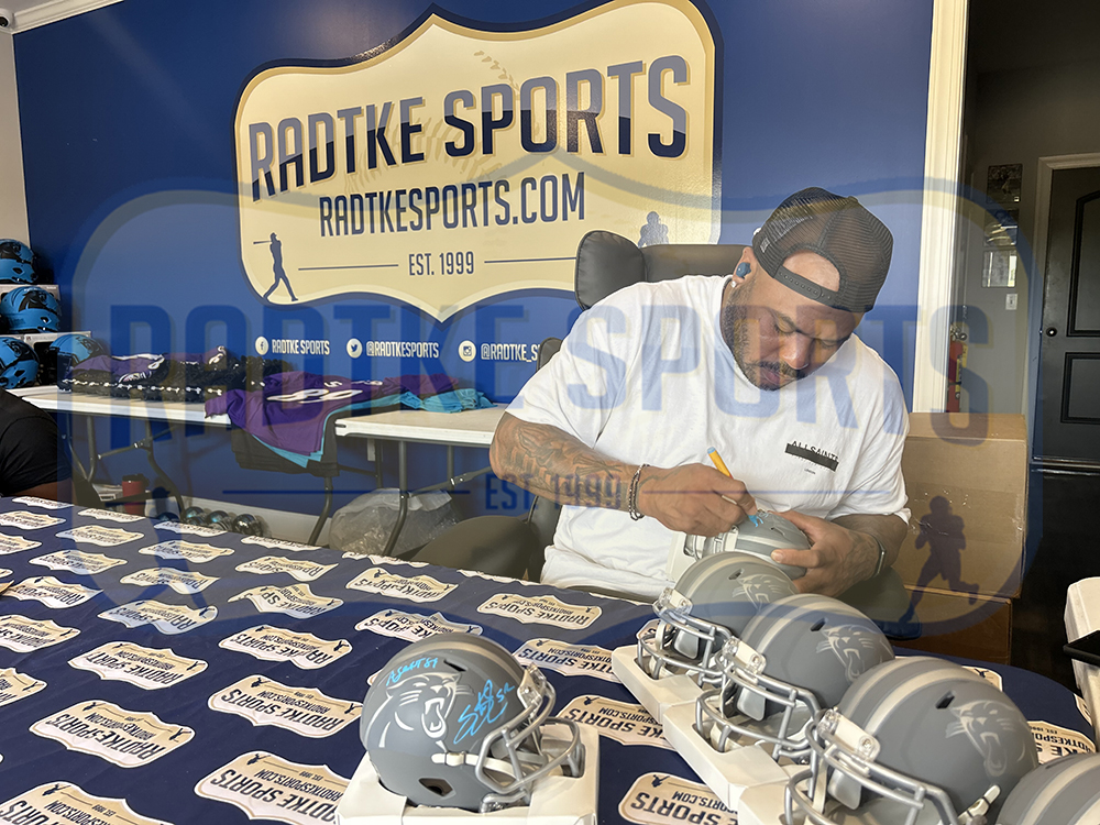 A Carolina Panthers Speed Slate NFL Mini Helmet hand signed by Steve Smith Sr. The item and signature are in excellent condition. In addition to signing his name, Steve also inscribed “Agent 89” on the item. Steve is one of the feistiest players in NFL history. His attitude and determination have made him a fan favorite in Baltimore and Carolina. Now bring home a piece of his exclusive memorabilia line that celebrates the career of a true NFL icon. AUTHENTICATION: The item has been tagged with a Radtke Sports SmarTag powered by Prova Technology, which gives you digital access to the items authentication records, including a proof picture from the signing. ***Radtke Sports uses professional lighting for their product images that may show reflections. We also feature watermarks on our proof pictures. The picture you see in the authentication record will NOT have a watermark. ***