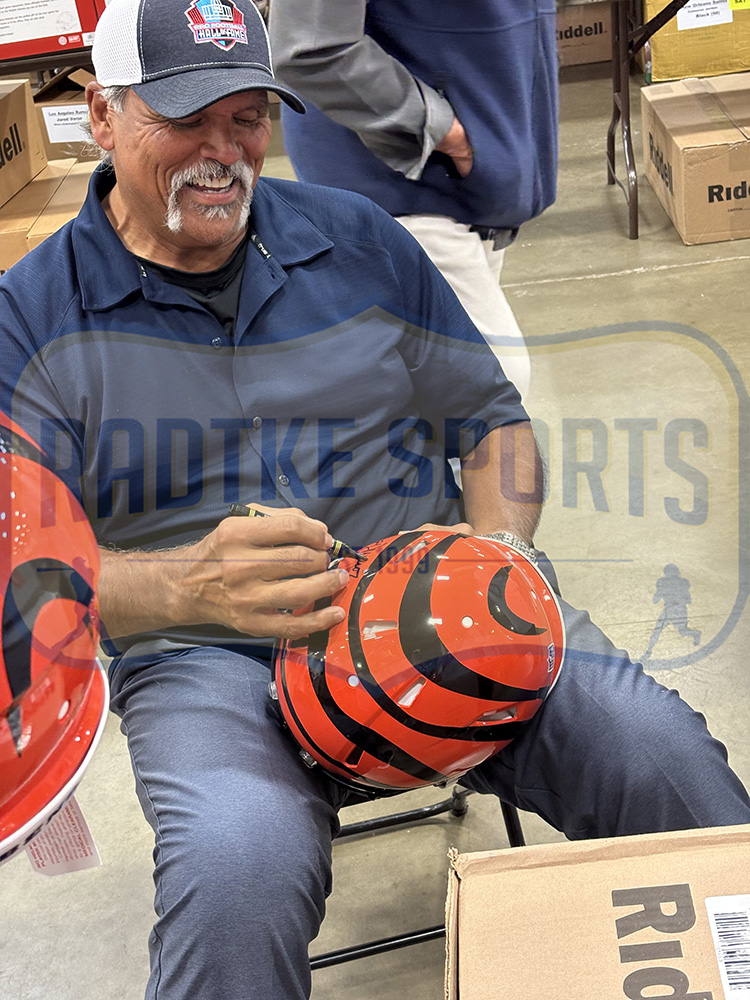 A Cincinnati Bengals Speed Authentic Helmet hand signed by Anthony Munoz. The item and signature are in excellent condition. Anthony is an 11x pro bowl selection and 9x first team all-pro selection, 2x AFC champion, and Class of 1989 NFL Hall of Fame inductee. AUTHENTICATION: The item has been tagged with a Radtke Sports SmarTag powered by Prova Technology, which gives you digital access to the items authentication records, including a proof picture from the signing. ***Radtke Sports uses professional lighting for their product images that may show reflections. We also feature watermarks on our proof pictures. The picture you see in the authentication record will NOT have a watermark. ***