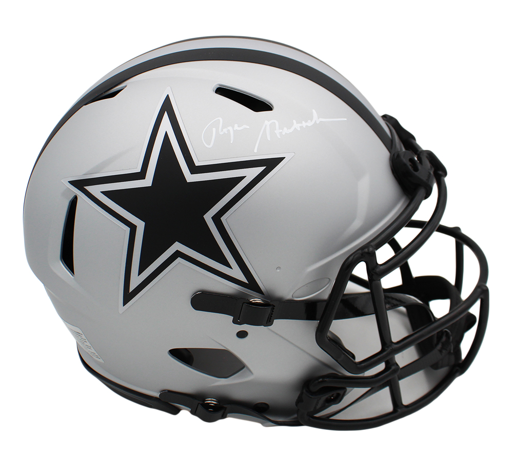A Dallas Cowboys Speed Authentic Rave Helmet hand signed by Roger Staubach. The item and signature are in excellent condition. Roger is a 2x Super Bowl Champion, Super Bowl MVP and a 6x Pro Bowler. AUTHENTICATION: Your item is tagged with a Radtke Sports SmarTag powered by Prova Technology, which gives you digital access to your items authentication records, which includes a proof picture from the signing. *** Radtke Sports uses professional lighting for our product images that may show reflections. We also feature watermarks on our proof pictures. The picture you see in your authentication records will NOT have a watermark. ***