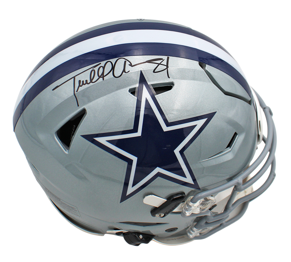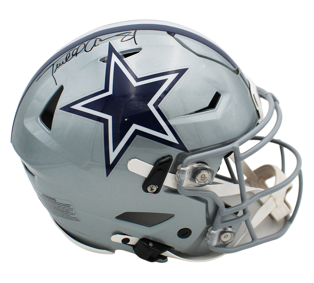 A Dallas Cowboys Speed Flex Authentic NFL Helmet hand signed by Terrell Owens. The item and signature are in excellent condition. Terrell is a former football wide receiver. He is a 6x Pro Bowler and is in the San Francisco 49ers Hall of Fame. AUTHENTICATION: Your item is tagged with a Radtke Sports SmarTag powered by Prova Technology, which gives you digital access to your items authentication records, which includes a proof picture from the signing. *** Radtke Sports used professional lighting for our product images that may show reflections. We also feature watermarks on our proof pictures. The picture you see in your authentication records will NOT have a watermark. ***
