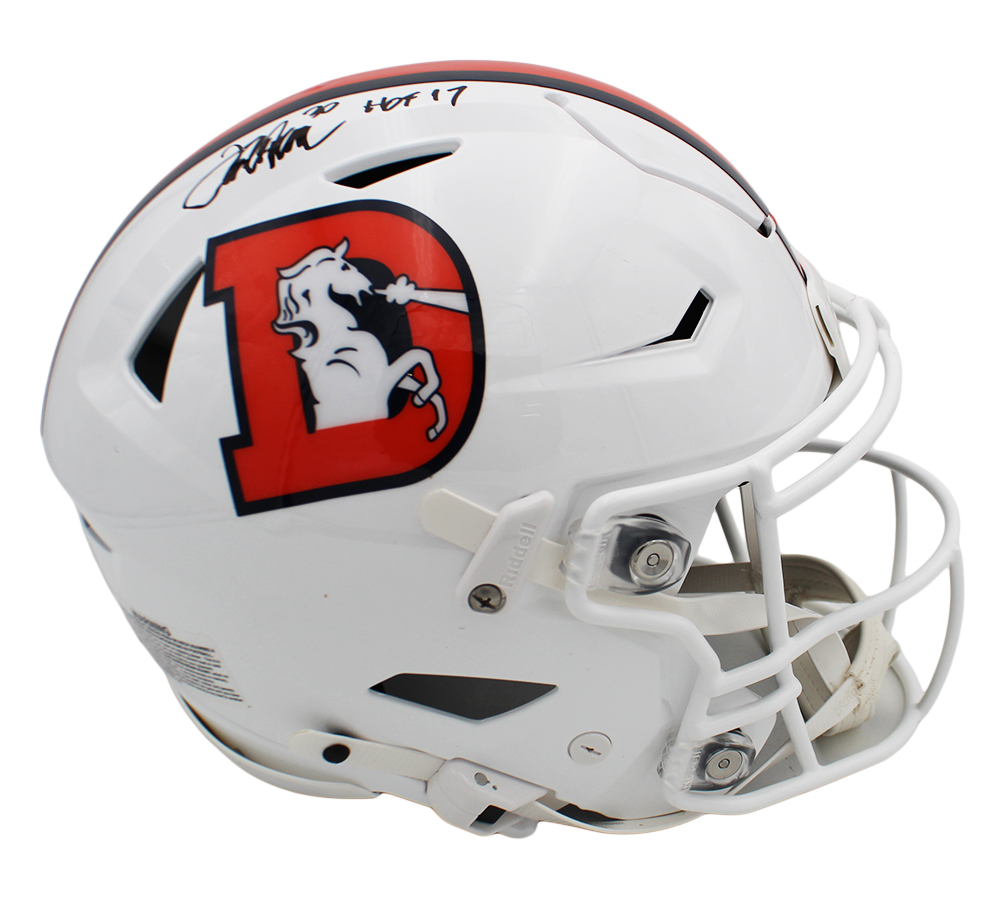 A Denver Broncos Speed Flex Authentic Alternate Snowcap NFL Helmet hand signed by Terrell Davis. The item and signature are in excellent condition. In addition to signing the item, Terrell inscribed “HOF 17” on the item. Terrell is a former NFL running back. He was drafted 6th round in the 1995 NFL Draft by the Denver Broncos. He is 2x Super Bowl Champion, Super Bowl (XXXII) MVP, 3x Pro Bowler, 3x First-Team All-Pro, and 1998 NFL MVP. AUTHENTICATION: Your item has been tagged with a Radtke Sports SmarTag powered by Prova Technology, which gives you digital access to your items authentication records, including a proof picture from the signing. ***Radtke Sports uses professional lighting for our product images that may show reflections. We also feature watermarks on our proof pictures. The picture you see in your authentication records will NOT have a watermark. ***