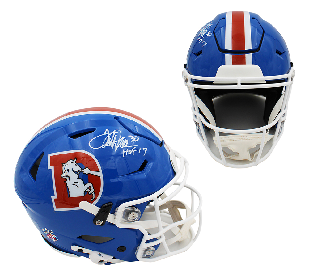 A Denver Broncos Speed Flex Authentic Throwback ’75-’96 Blue NFL Helmet hand signed by Terrell Davis. The item and signature are in excellent condition. In addition to signing his names, he also inscribed “HOF 17” on the item. Terrell is a former NFL running back. He was drafted 6th round in the 1995 NFL Draft by the Denver Broncos. He is 2x Super Bowl Champion, Super Bowl (XXXII) MVP, 3x Pro Bowler, 3x First-Team All-Pro, and 1998 NFL MVP. AUTHENTICATION: Your item has been tagged with a Radtke Sports SmarTag powered by Prova Technology, which gives you digital access to your items authentication records, including a proof picture from the signing. ***Radtke Sports uses professional lighting for our product images that may show reflections. We also feature watermarks on our proof pictures. The picture you see in your authentication records will NOT have a watermark. ***