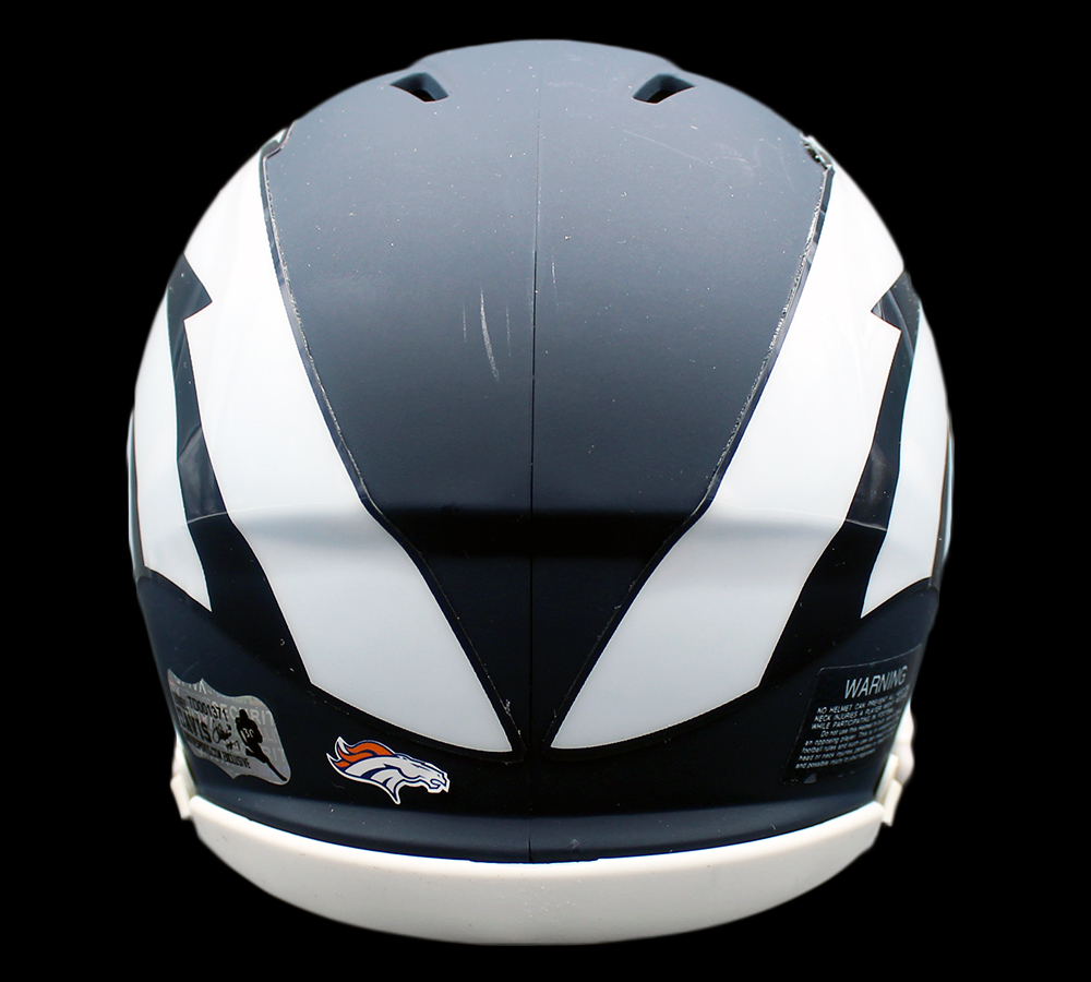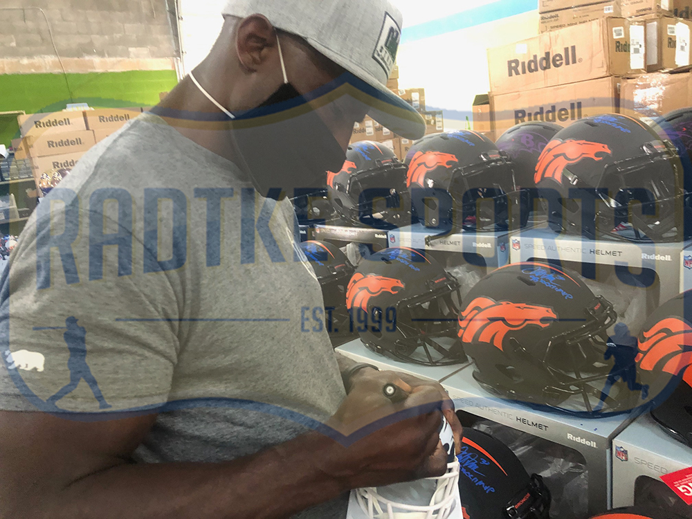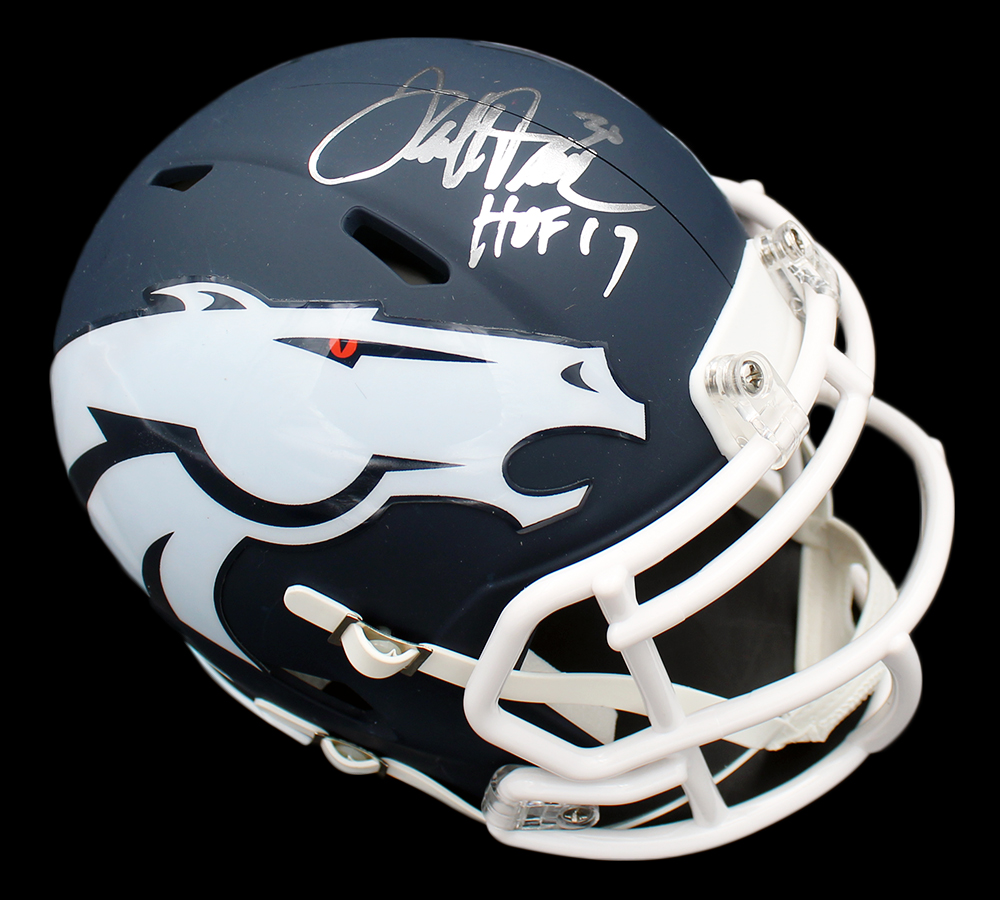 A Denver Broncos Speed AMP NFL Mini Helmet hand signed by Terrell Davis. The item and signature are in excellent condition. In addition to signing his name Terrell also inscribed “HOF 17” on the item. – Terrell is a Super Bowl Champion, Super Bowl Most Valuable Player, and 3x Pro Bowler! – AUTHENTICATION: The item is accompanied by a Terrell Davis Radtke Sports Exclusive Certificate of Authenticity – Terrell Davis Radtke Sports Exclusive Serial Numbered and Databased Hologram – Picture of Terrell from the Signing – *** Radtke Sports uses professional lighting for our product images that may show reflections. We also feature watermarks on our proof pictures. The picture you receive will NOT have a watermark***