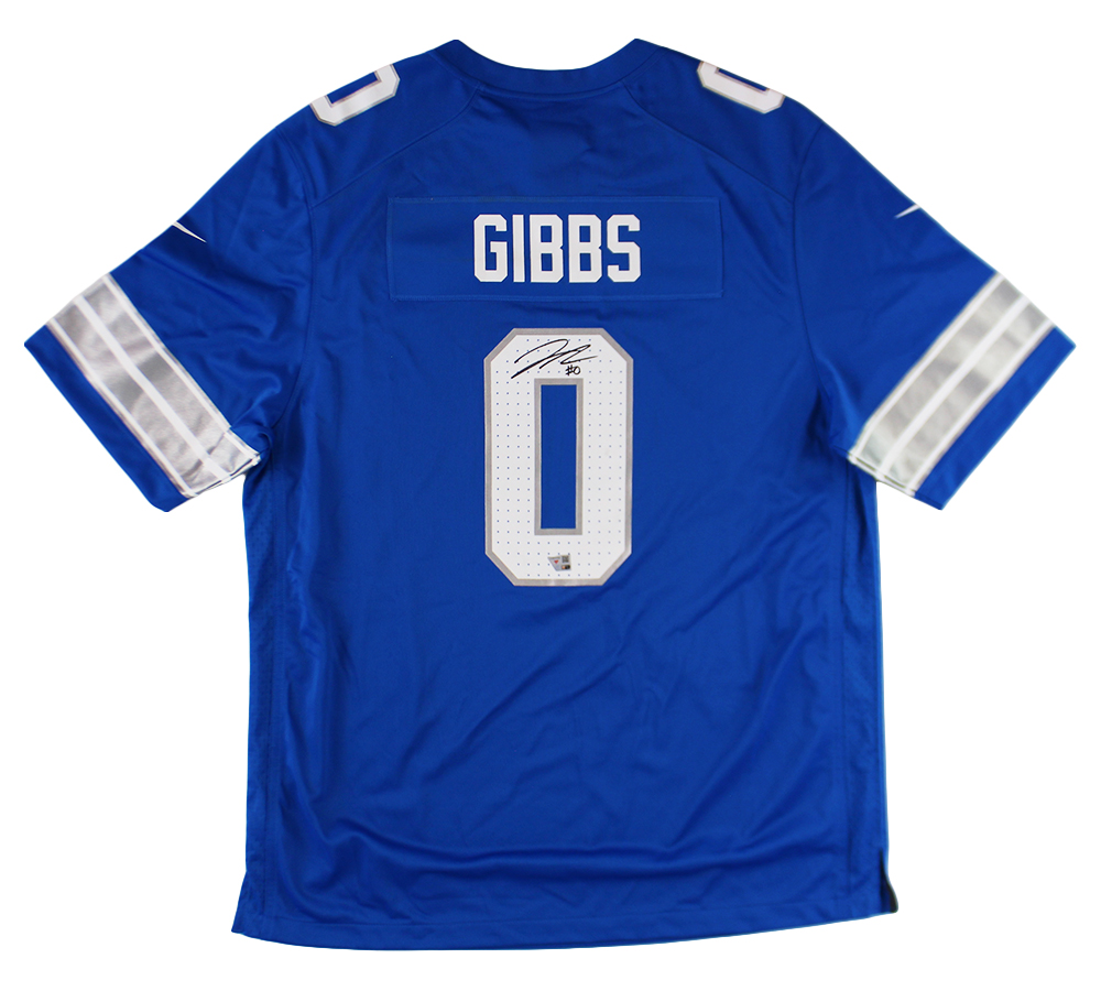 A Detroit Lions Nike Game Blue NFL Jersey hand signed by Jahmyr Gibbs. The item and signature are in excellent condition. Jahmyr is a football running back selected in the 2023 NFL Draft by the Detroit lions. AUTHENTICATION: The item is accompanied by a Fanatics Authentic Serial Numbered and Databased Hologram *** Radtke Sports uses professional lighting for our product images that may show reflections. ***