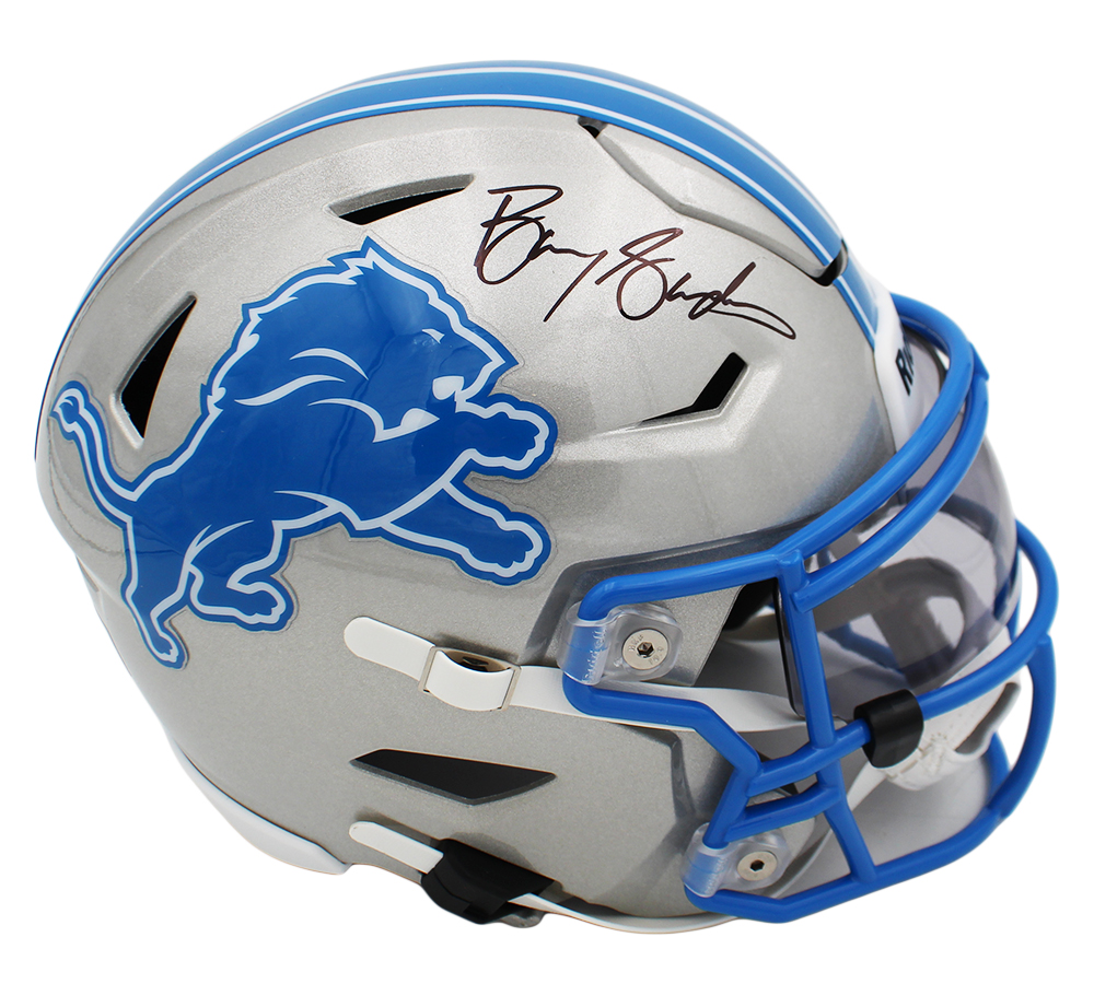 A Detroit Lions Speed Flex Mid-Size NFL Midi Helmet hand signed by Barry Sanders. The item and signature are in excellent condition. Barry Sanders is a former professional American football player, widely regarded as one of the greatest running backs in NFL history. He played for the Detroit Lions from 1989 to 1998. Sanders rushed for over 15,000 yards in his career and earned 10 Pro Bowl selections. Sanders was inducted into the Pro Football Hall of Fame in 2004. AUTHENTICATION: The item is accompanied by a Schwartz Sports Certificate of Authenticity – Schwartz Sports Serial Numbered & Databased Hologram *** Radtke Sports uses professional lighting for our product images that may show reflections.***
