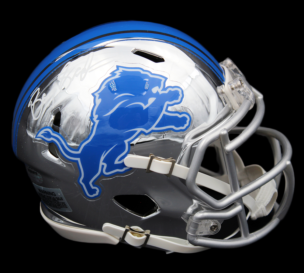 A Detroit Lions Speed Chrome NFL Mini Helmet hand signed by Barry Sanders. The item and signature are in excellent condition. Barry is a 10x Pro Bowler, 10x All-Pro, 4x Rushing Champion, and NFL MVP. AUTHENTICATION: Beckett Certificate of Authenticity – Beckett Serial Numbered & Databased Hologram *** Radtke Sports uses professional lighting for our product images that may show reflections. ***