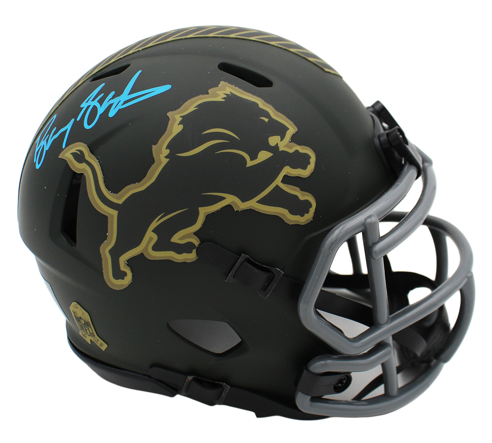 A Detroit Lions Speed Salute to Service 4 NFL Mini Helmet hand signed by Barry Sanders. The item and signature are in excellent condition. Barry is a 10x Pro Bowler, 10x All-Pro, 4x Rushing Champion, and NFL MVP. AUTHENTICATION: The item is accompanied by a Schwartz Sports Certificate of Authenticity – Schwartz Sports Serial Numbered & Databased Hologram.*** Radtke Sports uses professional lighting for our product images that may show reflections.***