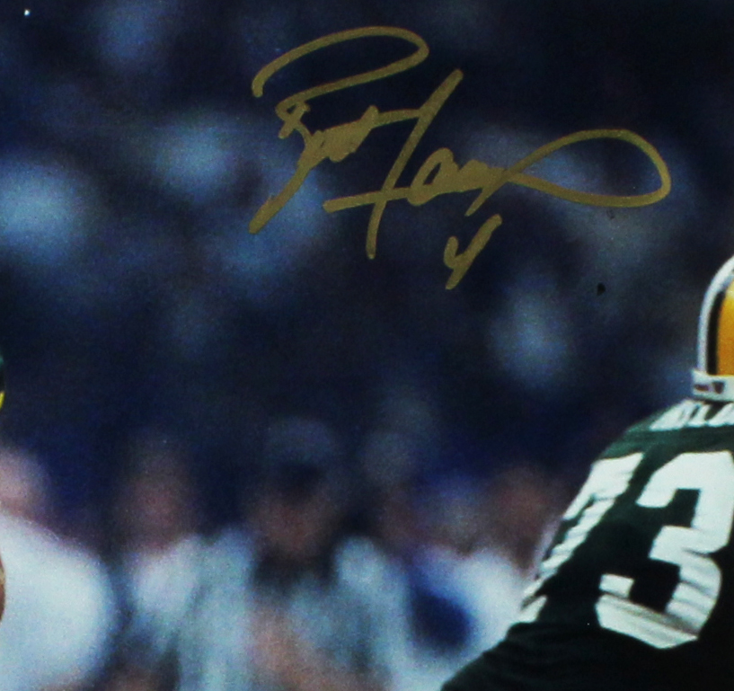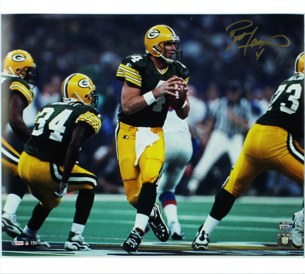 A Green Bay Packers Unframed 16×20 Running with Ball NFL Photo hand signed by Brett Favre. The item and signature are in excellent condition. A 20 year veteran of the NFL, Brett is a Super Bowl Champion, 11x Pro Bowler, 3x AP NFL Most Valuable Player, 4x NFL passing touchdowns leader, and 2x passing yards leader. His number, 4, has been retired by both the Green Bay Packers and the Southern Miss Golden Eagles. Brett was inducted into the Pro Football Hall of Fame in 2016. AUTHENTICATION: Your item has been tagged with a Brett Favre Exclusive Radtke Sports SmarTag powered by Prova Technology, which gives you digital access to your items authentication records. ***Radtke Sports uses professional lighting for our product images that may show reflections. ***
