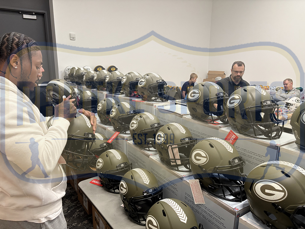 A Green Bay Packers Speed Authentic Salute To Service NFL Helmet hand signed by Josh Jacobs. The item and signature are in excellent condition. Josh was selected in the NFL draft in 2019 by the Oakland Raiders. He attended college at Alabama. He is currently playing for the Green Bay Packers. He is an NFL Rushing Yard leader and a 2x Pro Bowler. AUTHENTICATION: Your item has been tagged with a Radtke Sports SmarTag Powered by Prova Technology, which gives you digital access to your items authentication records, including a proof picture from the signing. ***Radtke Sports uses professional lighting for our product images that may show reflections. We also feature watermarks on our proof pictures. The picture you see in your authentication records will NOT have a watermark. ***