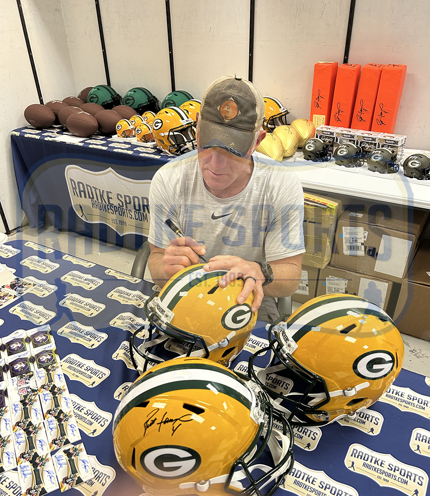 A Green Bay Packers Speed Replica NFL Helmet hand signed by Brett Favre. The item and signature are in excellent condition. A 20 year veteran of the NFL, Brett is a Super Bowl Champion, 11x Pro Bowler, 3x AP NFL Most Valuable Player, 4x NFL passing touchdowns leader, and 2x passing yards leader. His number, 4, has been retired by both the Green Bay Packers and the Southern Miss Golden Eagles. Brett was inducted into the Pro Football Hall of Fame in 2016. AUTHENTICATION: Your item has been tagged with a Brett Favre Exclusive Radtke Sports SmarTag powered by Prova Technology, which gives you digital access to your items authentication records, including a proof picture from the signing. ***Radtke Sports uses professional lighting for our product images that may show reflections. We also feature watermarks on our proof pictures. The picture you see in your authentication records will NOT have a watermark. ***