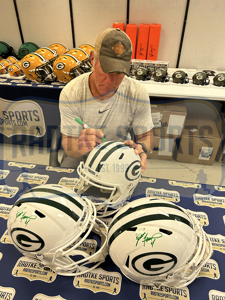 A Green Bay Packers Speed Replica Alternate 2024 White NFL Helmet hand signed by Brett Favre. The item and signature are in excellent condition. Brett is one of the most iconic players in NFL history. A 20 year veteran of the NFL, Brett is a Super Bowl Champion, 11x Pro Bowler, 3x AP NFL Most Valuable Player, 4x NFL passing touchdowns leader, and 2x passing yards leader. His number, 4, has been retired by both the Green Bay Packers and the Southern Miss Golden Eagles. Brett was inducted into the Pro Football Hall of Fame in 2016. AUTHENTICATION: The item is accompanied by a Brett Favre Exclusive Radtke Sports SmarTag powered by Prova Technology and a picture of Brett from the Signing – ***Radtke Sports uses professional lighting for our product images that may show reflections. We also feature watermarks on our proof pictures. The picture you receive will NOT have a watermark.***