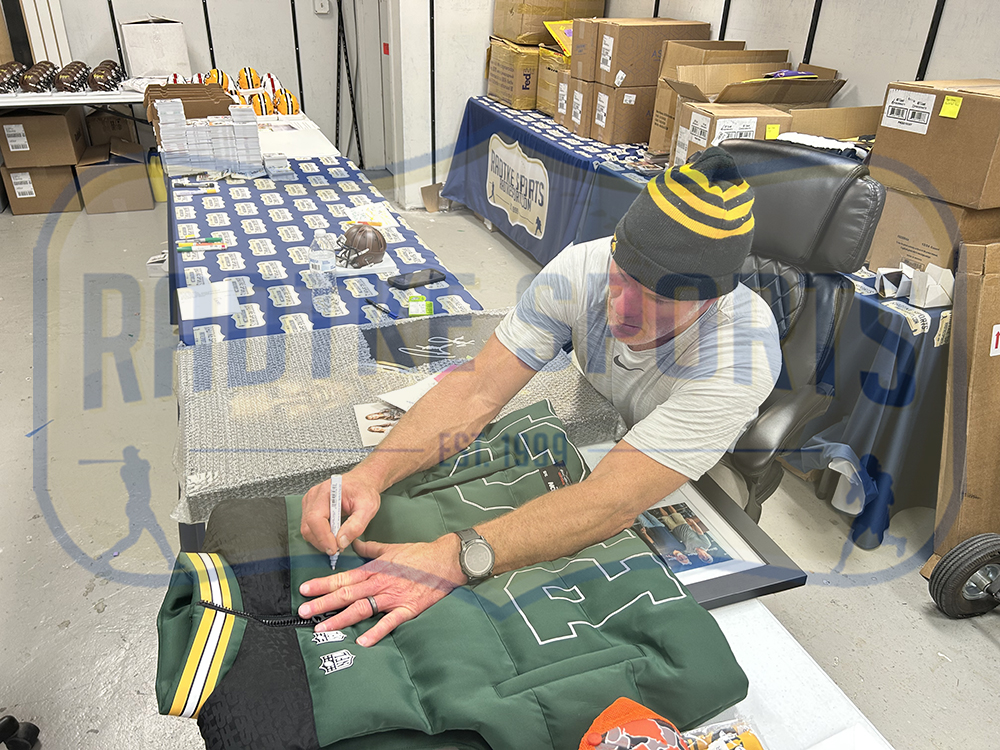 A Green Bay Packers NFL Green Puffer Vest hand signed by Brett Favre. The item and signature are in excellent condition. Brett is one of the most iconic players in NFL history. A 20 year veteran of the NFL, Brett is a Super Bowl Champion, 11x Pro Bowler, 3x AP NFL Most Valuable Player, 4x NFL passing touchdowns leader, and 2x passing yards leader. His number, 4, has been retired by both the Green Bay Packers and the Southern Miss Golden Eagles. Brett was inducted into the Pro Football Hall of Fame in 2016. AUTHENTICATION: Your item has been tagged with a Brett Favre Exclusive Radtke Sports SmarTag powered by Prova Technology, which gives you digital access to your items authentication records, including a proof picture from the signing. ***Radtke Sports uses professional lighting for our product images that may show reflections. We also feature watermarks on our proof pictures. The picture you see in your authentication records will NOT have a watermark. ***