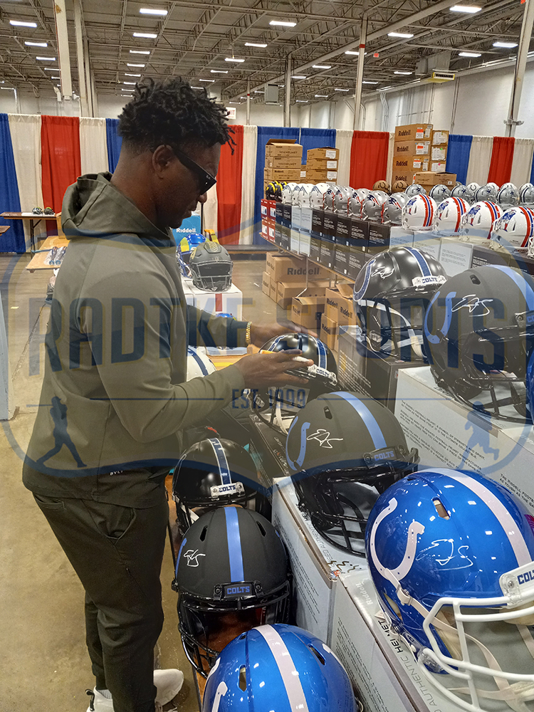 A Indianapolis Colts Speed Replica Alternate Black NFL Helmet hand signed by Edgerrin James. The item and signature are in excellent condition. Edgerrin James is a former football running back and was drafted by the Indianapolis Colts fourth overall in the 1999 NFL Draft. Edgerrin played college football at the University of Miami. AUTHENTICATION: The item has been tagged with a Radtke Sports SmarTag powered by Prova Technology, which gives you digital access to the items authentication records, including a proof picture from the signing. ***Radtke Sports uses professional lighting for their product images that may show reflections. We also feature watermarks on our proof pictures. The picture you see in the authentication record will NOT have a watermark. ***