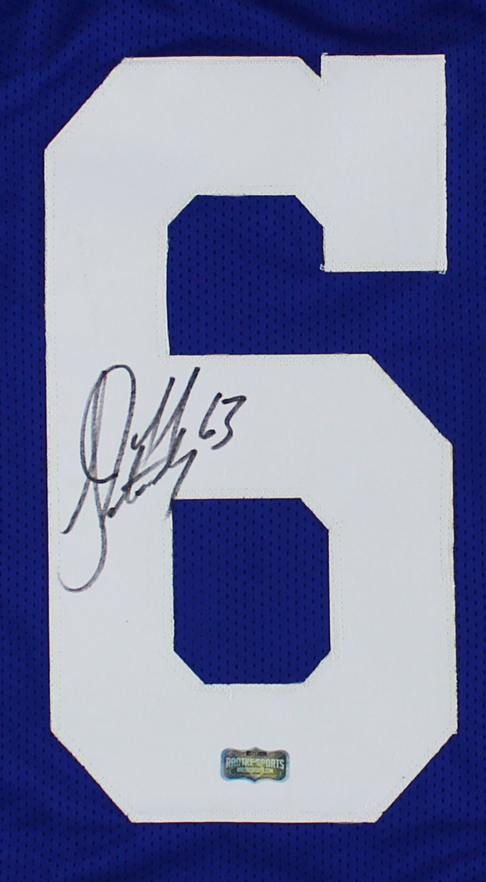 A Indianapolis Custom Blue Jersey hand signed by Jeff Saturday. The item and signature are in excellent condition. Jeff is a Super Bowl Champion (XLI). Jeff 6xPro Bowl (2005-2007,2009,2010,2012). Jeff 2xFirst-Team All-Pro (2005,2007). Jeff 2xSecond-team ALL-Pro (2006,2009). Jeff is a NFL Alumni Offensive Lineman of the Year (2007). Jeff 2xFirst-team ALL-ACC (1996,1997).AUTHENTICATION: The item is accompanied by a Radtke Sports Certificate of Authenticity – Radtke Sports Serial Numbered and Databased Hologram – Picture of Jeff from the signing. – *** Radtke Sports uses professional lighting for our product images that may show reflections. We also feature watermarks on our proof pictures. The picture you receive will NOT have a watermark.***
