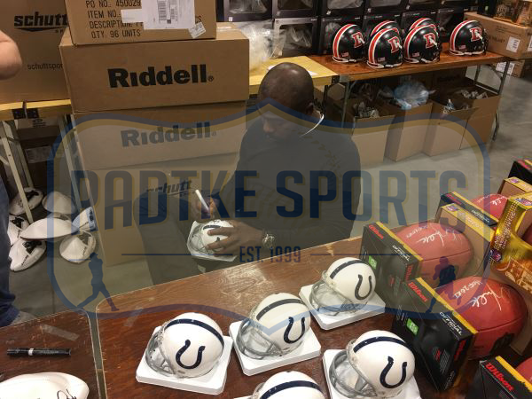 An Indianapolis Colts Mini Helmet hand signed by Marshall Faulk. The item and signature are in excellent condition. Marshall was the second overall pick in the 1994 NFL Draft, he is a Super Bowl Champion and 7x Pro Bowler. AUTHENTICATION: The Item is accompanied by a Radtke Sports Certificate of Authenticity – Radtke Sports Serial Numbered and Databased Hologram – Picture of Marshall from the Signing – *** Radtke Sports uses professional lighting for our product images that may show reflections. We also feature watermarks on our proof pictures. The picture you receive will NOT have a watermark***