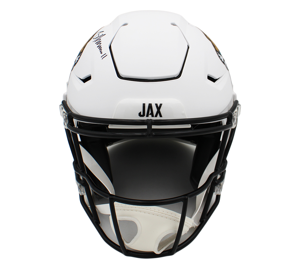 A Jacksonville Jaguars Speed Flex Authentic Alternate White NFL Helmet Hand Signed by Brian Thomas Jr. The signature and item are in excellent condition. Brian is a wide receiver for the Jacksonville Jaguars, drafted 23rd overall in the 2024 NFL Draft after leading the FBS with 17 touchdown receptions during his junior year at LSU. In his rookie NFL season, he set Jaguar Rookie records with 87 receptions, 1,282 receiving yards (ranking 3rd in the league), and 10 touchdowns, earning a Pro Bowl selection and a spot on the PFWA All-Rookie Team. AUTHENTICATION: The item has been tagged with a Fanatics Authentic Serial Numbered and Databased Hologram *** Radtke Sports uses professional lighting for our product images that may show reflections. ***