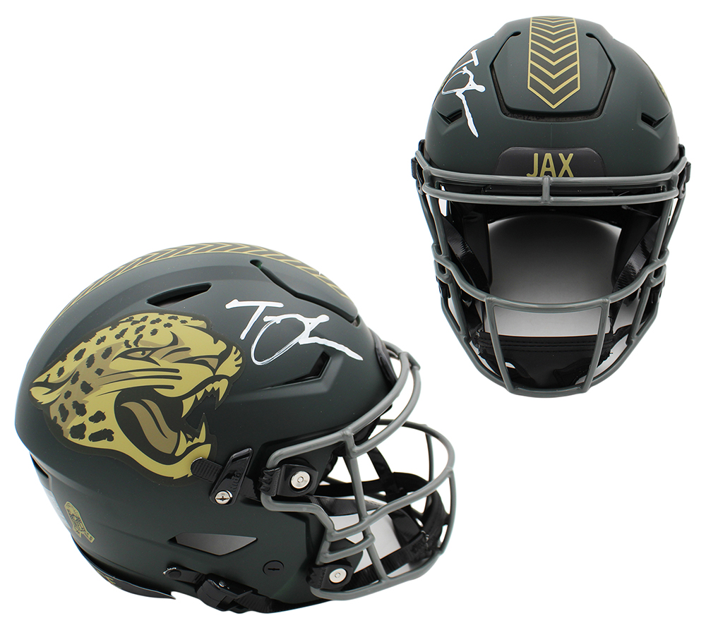 A Jacksonville Jaguars Speed Flex Authentic Salute to Service 4 NFL Helmet hand signed by Trevor Lawrence. The item and signature are in excellent condition. Trevor was drafted into the NFL in 2021. He is CFP National champion, a CFP National Championship Offensive MVP (2018) and a First-team All-American (2020). AUTHENTICATION: The item is accompanied by a Fanatics Authentic Serial Numbered and Databased Hologram *** Radtke Sports uses professional lighting for our product images that may show reflections. ***