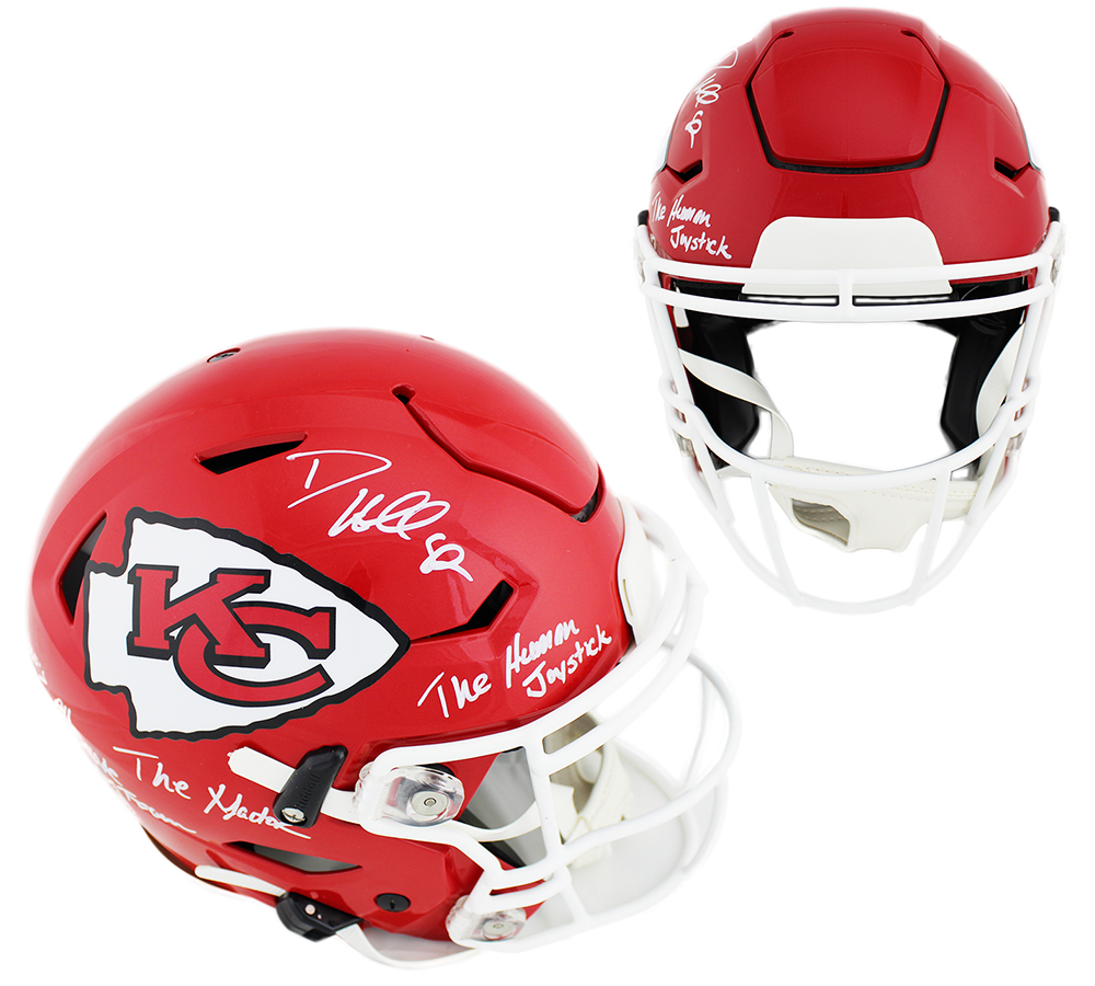 A Kansas City Chiefs Speed Flex Authentic NFL Helmet hand signed by Dante Hall. The item and signature are in excellent condition. In addition to signing his name, Dante also inscribed “Human Joystick”, “X-Factor”, and “2000’s All Decade Team” on the item. Dante Hall is a former NFL Return Specialist and Wide Receiver. He started out playing college football at Texas A&M, and then was later drafted into the NFL by the Kansas City Chiefs where he played for 6 out of his 9 seasons in the NFL. Dante was ranked 10th greatest Return Specialist in NFL History. AUTHENTICATION: The item features a Radtke Sports Certificate of Authenticity – Radtke Sports Serial Numbered and Databased Hologram – Picture of Dante from the Signing *** Radtke Sports uses professional lighting for our product images that may show reflections. We also feature watermarks on our proof pictures. The picture you receive will NOT have a watermark. ***
