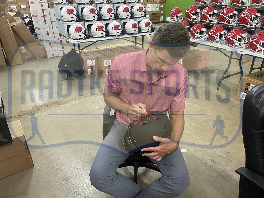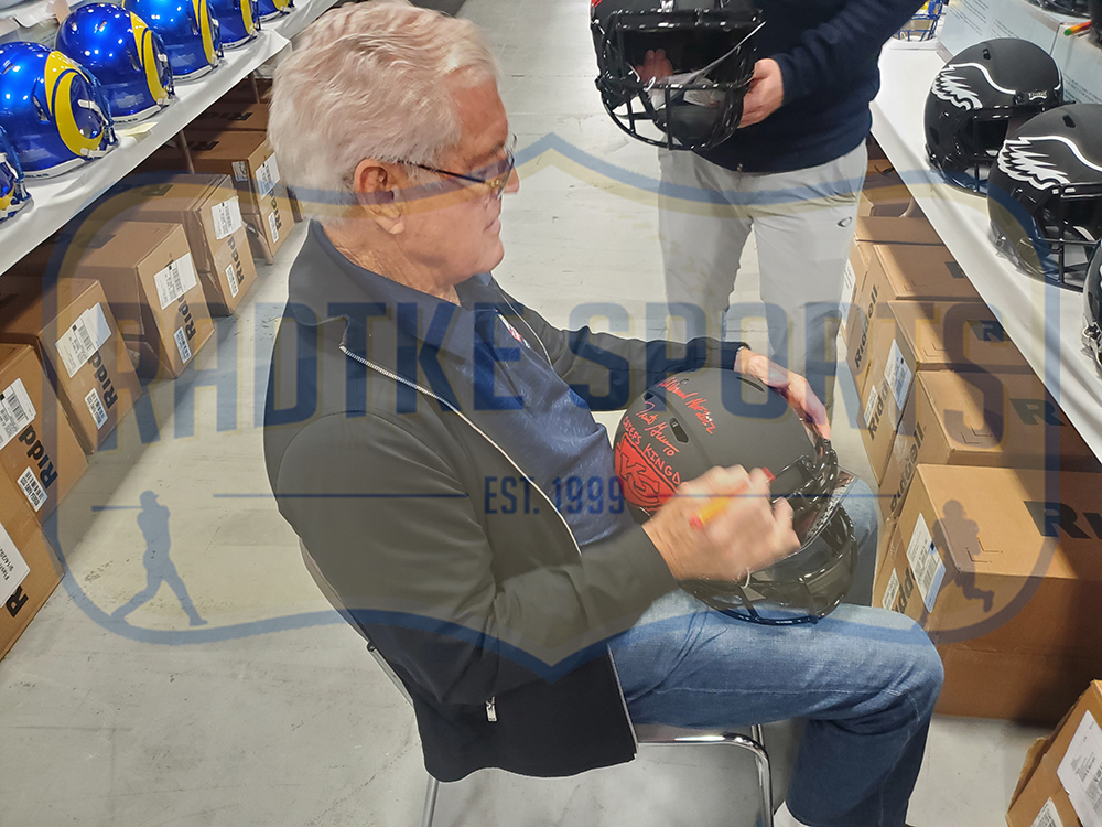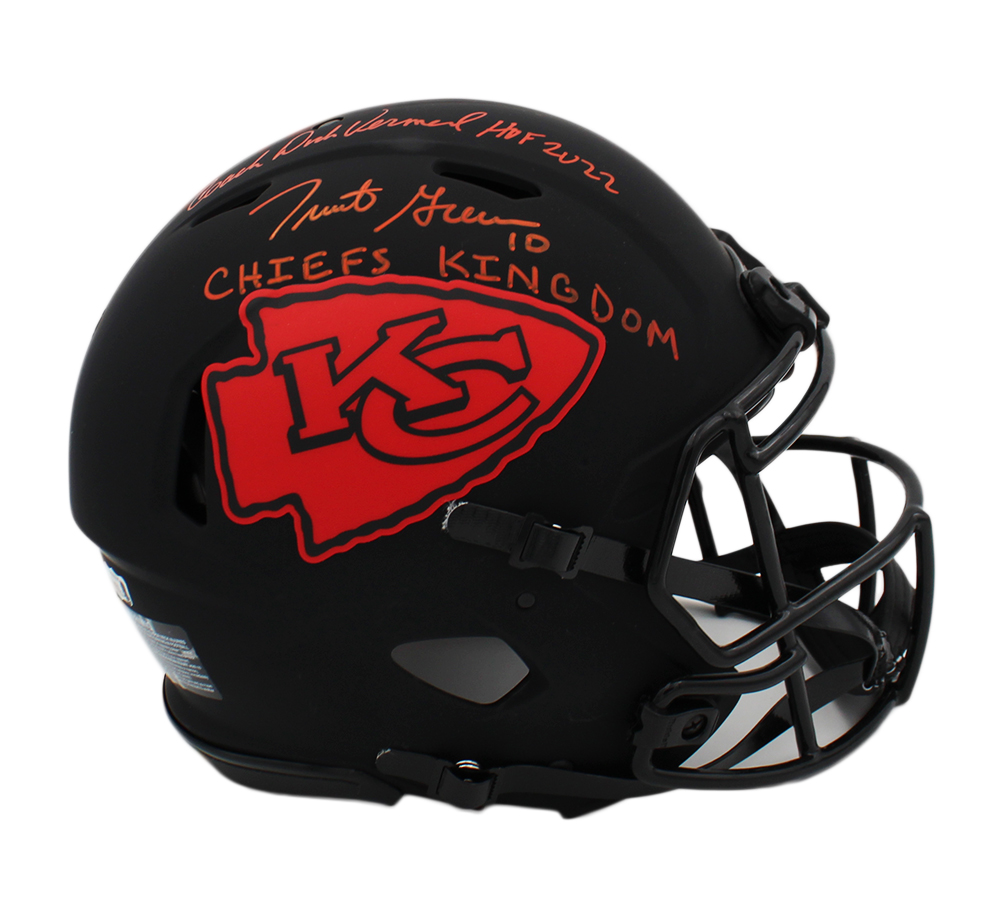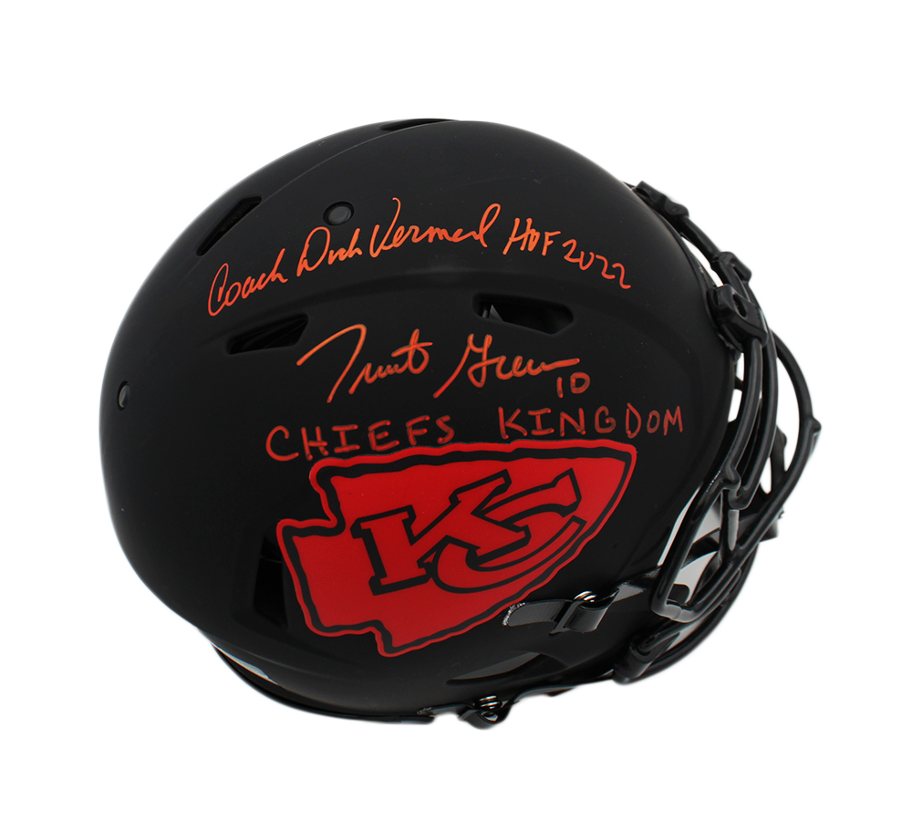 A Kansas City Chiefs Speed Authentic Eclipse NFL Helmet hand signed by Dick Vermeil & Trent Green. The item and signature are in excellent condition. In addition to signing their names, Dick & Trent also inscribed “HOF 2022 & Chiefs Kingdom” on the item. Dick has had a very successful Football Coaching career. He lead teams like the Philadelphia Eagles, St. Louis Rams, Kansas City Chiefs, UCLA Bruins with losing records to victory, winning the Rose Bowl, Playoffs & Super Bowls. He has been Coach of the Year several times and was inducted into the Pro Football Hall of Fame in 2022. Trent was drafted into the NFL in 1993. He is a Super Bowl champion (XXXIV), 2xPro Bowler (2003,2005).  AUTHENTICATION: The item is accompanied by a Dick Vermeil Exclusive Radtke Sports Certificate of Authenticity – Dick Vermeil Exclusive Radtke Sports Serial Numbered and Databased Hologram – Picture of Dick & Trent from the Signing *** Radtke Sports uses professional lighting for our product images that may show reflections. We also feature watermarks on our proof pictures. The picture you receive will NOT have a watermark. ***