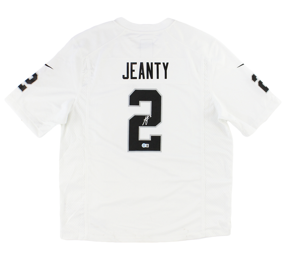 A Las Vegas Raiders Nike Game White NFL Jersey hand signed by Ashton Jeanty. The signature and item are in excellent condition. Ashton is a football running back drafted into the NFL in 2025 by the Las Vegas Raiders after playing for Boise State Broncos. He was the Mountain West Conference male athlete of the year in 2025. AUTHENTICATION: The ite is tagged with a Beckett Serial Numbered and Databased Hologram. ***Radtke Sports uses professional lighting for our product images that may show reflections. ***