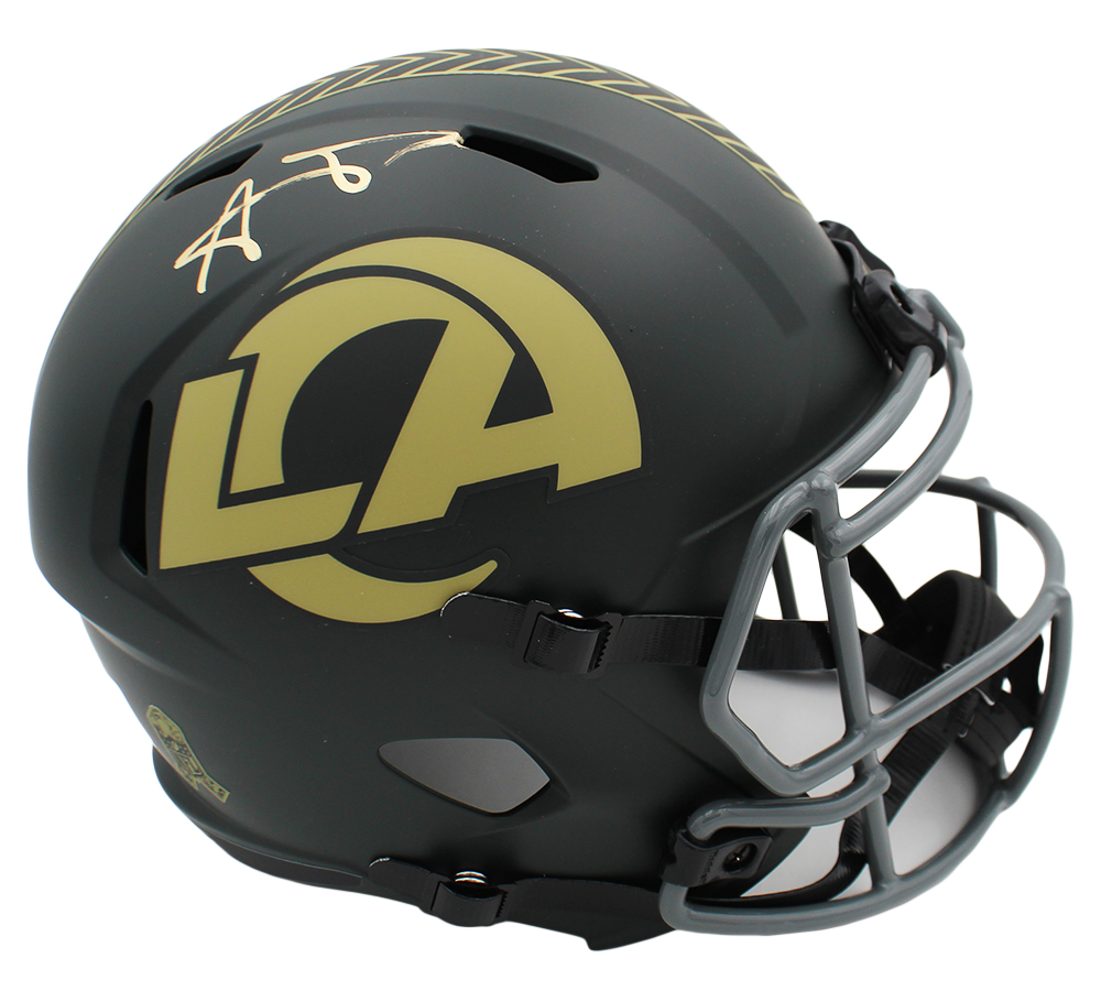 A Los Angeles Rams Speed Replica Salute To Service 4 NFL Helmet hand signed by Aaron Donald. The item and signature are in excellent condition. Aaron is a 4x Pro Bowler, 3x First-team All-Pro, AP NFL Defensive Player of the Year, and NFL Defensive Rookie of the Year. AUTHENTICATION: The item is accompanied by a Beckett Serial Numbered & Databased Hologram *** Radtke Sports uses professional lighting for their product images that may show reflections. ***