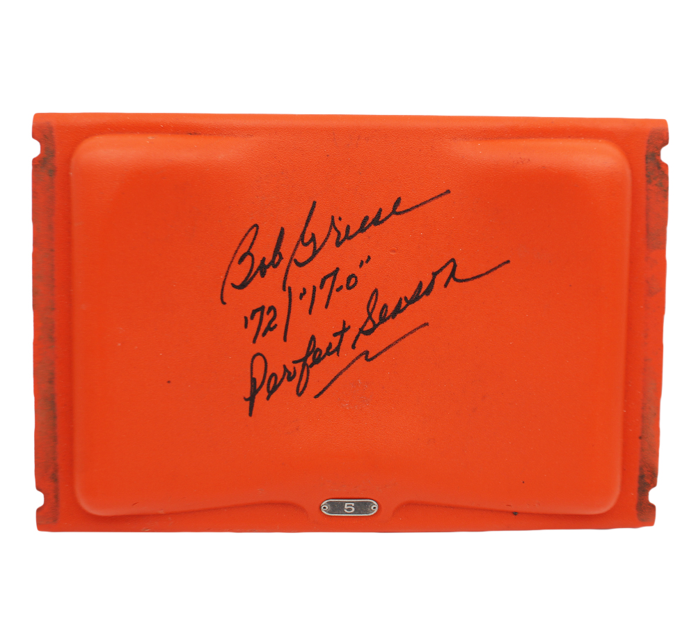 A Miami Dolphins Orange Bowl Orange Stadium Seatback hand signed by Bob Griese. The signature is in excellent condion. The seatback is in used condition. In addition to signing his name, Bob also inscribed “’72/17-0 Perfect Season” on the item. Bob is a former football quarterback for the Miami Dolphins. He led the team to 3 consecutive Super Bowls with 2 of them being victories. He also played in 6x Pro Bowls and was inducted into the Pro Football Hall of Fame in 1990. AUTHENTICATION: The item is accompanied by a JSA Certificate of Authenticity, JSA Serial Numbered & Databased Hologram. ***Radtke Sports uses professional lighting for our product images that may show reflections ***