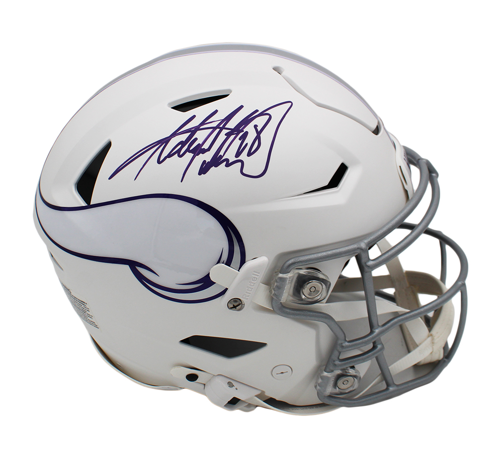 A Minnesota Vikings Speed Flex Authentic Alternate White NFL Helmet hand signed by Adrian Peterson. The item and signature are in excellent condition. Peterson played college football at the University of Oklahoma, where he became a standout before entering the NFL in 2007. He was drafted by the Minnesota Vikings with the 7th overall pick. Over his career, he set numerous records, including the NFL single-season rushing yards record with 2,097 yards in 2012, just eight yards shy of breaking the all-time record. He was a seven-time Pro Bowl selection and an NFL MVP in 2012. Peterson played for multiple teams during his career, including the Minnesota Vikings, New Orleans Saints, Arizona Cardinals, Washington Football Team, and briefly with the Tennessee Titans. AUTHENTICATION: The item has been tagged with a Radtke Sports SmarTag powered by Prova Technology, which gives you digital access to the items authentication records, including a proof picture from the signing. ***Radtke Sports uses professional lighting for their product images that may show reflections. We also feature watermarks on our proof pictures. The picture you see in the authentication record will NOT have a watermark. ***