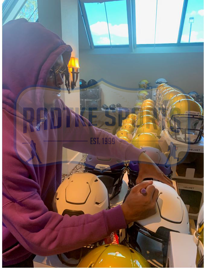 An Minnesota Vikings Speed Flex Authentic Lunar NFL Helmet hand signed by Justin Jefferson. The item and signature are in excellent condition. Justin is a wide receiver for the Minnesota Vikings. He played college football at LSU. He was a CFP National Champion and Second-team All-SEC in 2019. AUTHENTICATION: The item is accompanied by a Radtke Sports Certificate of Authenticity – Radtke Sports Serial Numbered and Databased Hologram – Picture of Justin from the Signing *** Radtke Sports uses professional lighting for our product images that may show reflections. We also feature watermarks on our proof pictures. The picture you receive will NOT have a watermark. ***